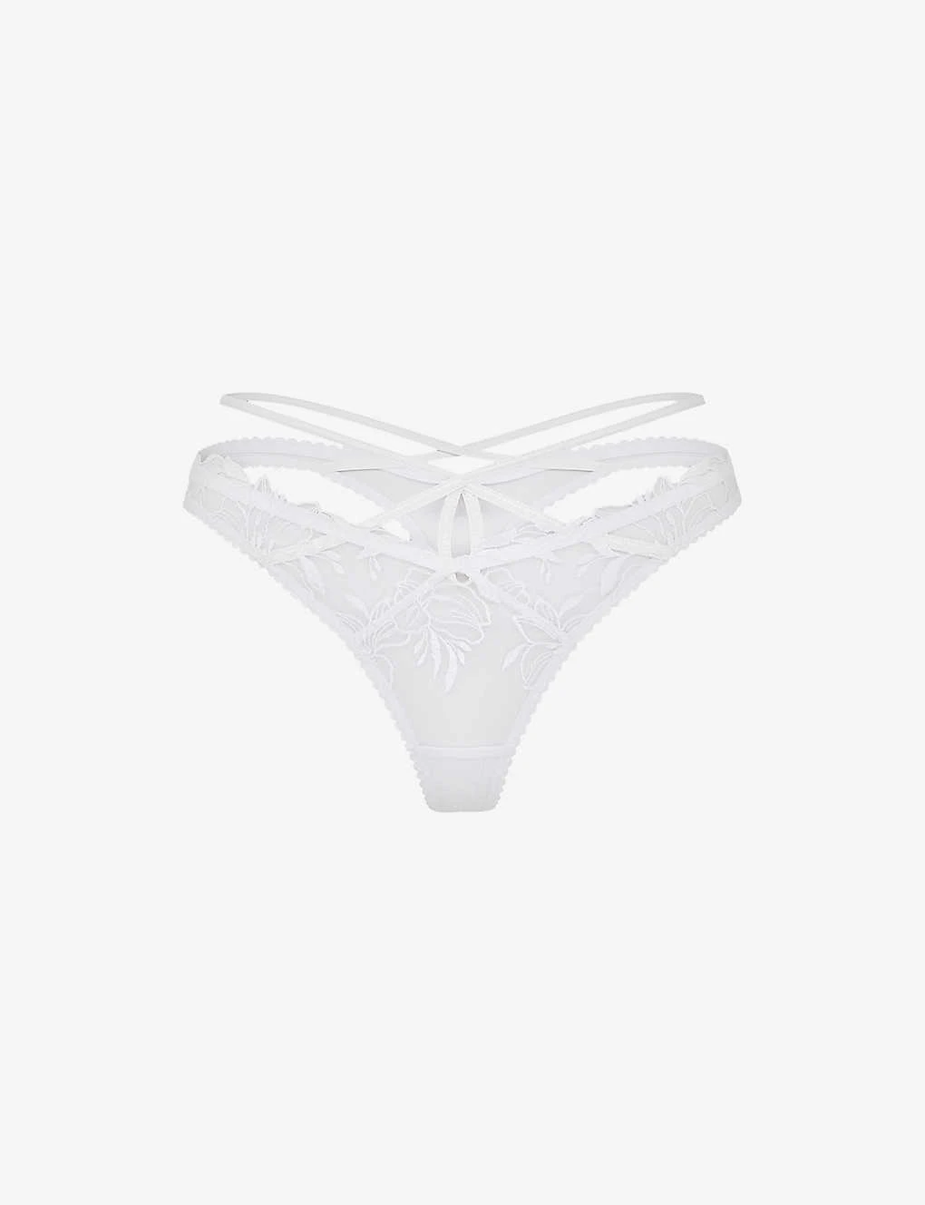 - Low-rise, thong back, all-over embroidery, strappy front and back, PVC binding, cutaway, sheer