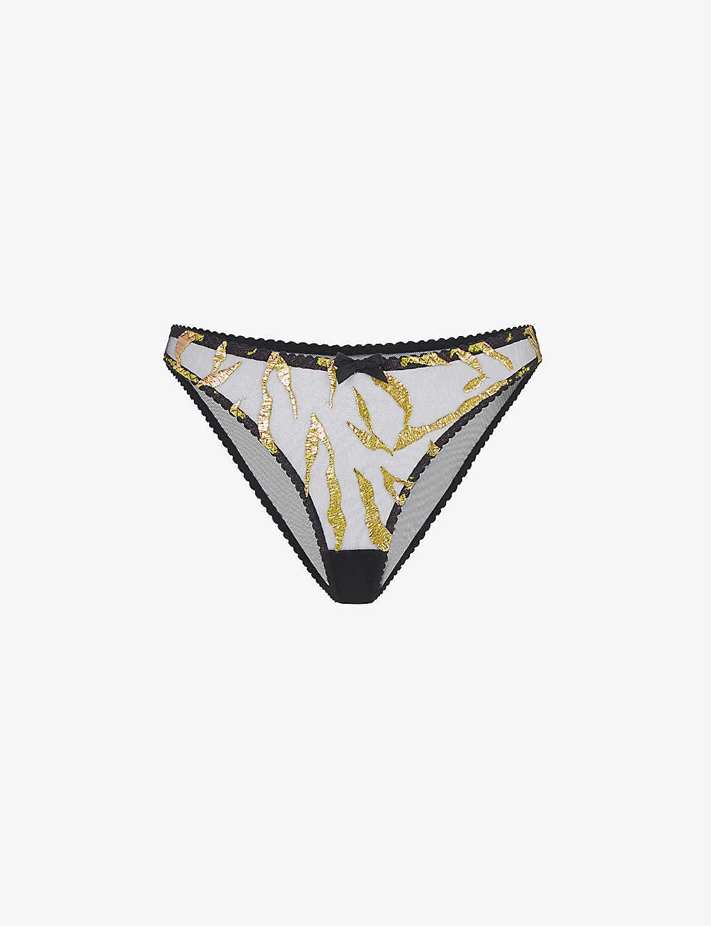 - Mid-rise, scalloped trims, zebra-print foil motifs, semi-sheer, lined gusset, full coverage at back