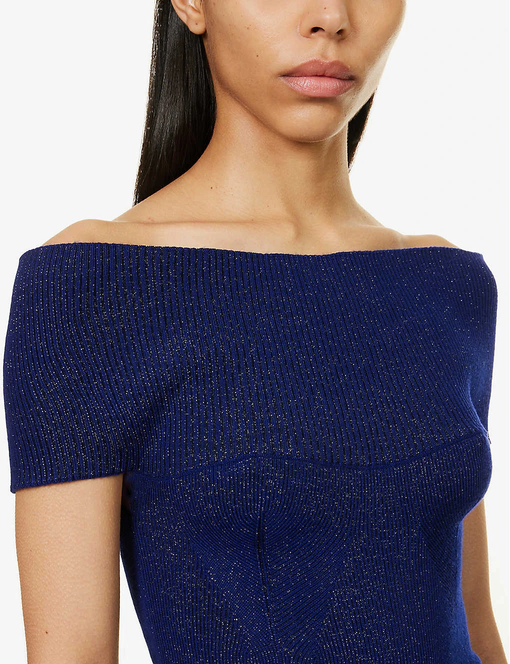 - Regular-fit, straight-across neck, folded trim at chest, fit-and-flare silhouette, all-over ribbed knit and metallic weave, curved hem