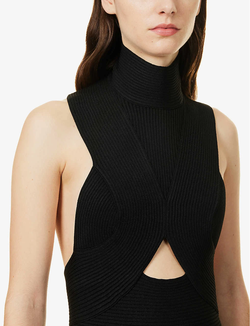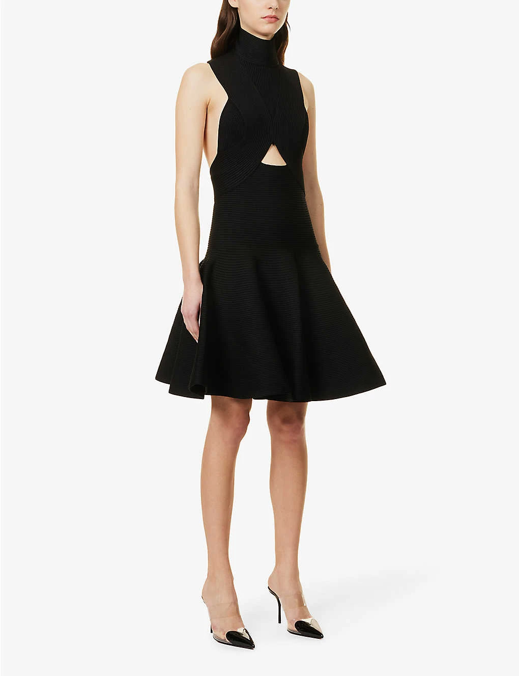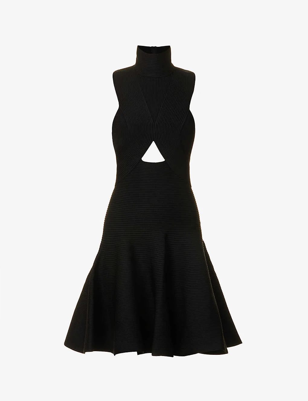 - Regular-fit, turtleneck, sleeveless, cut-out panel at chest, all-over ribbed knit, flared skirt, peplum hem