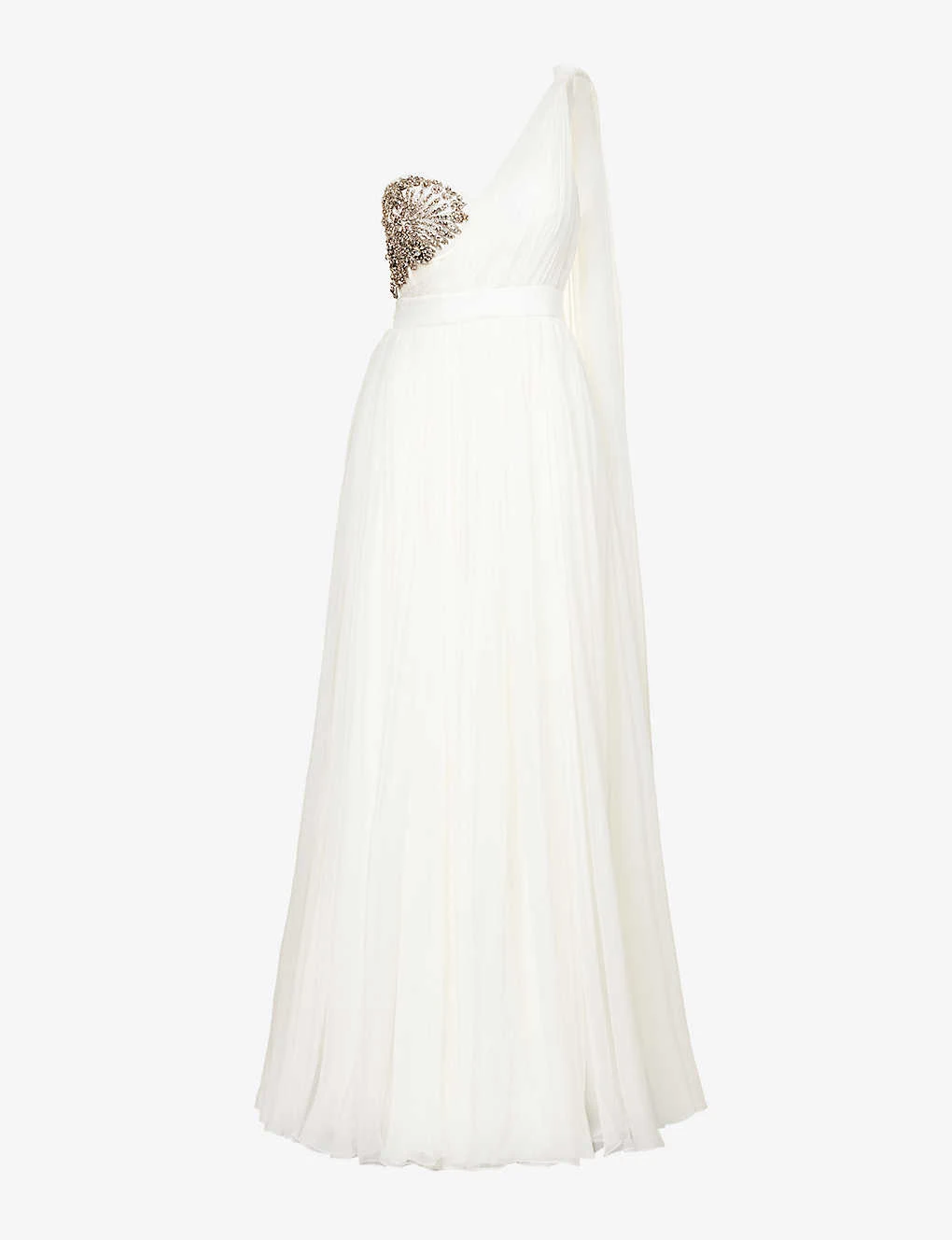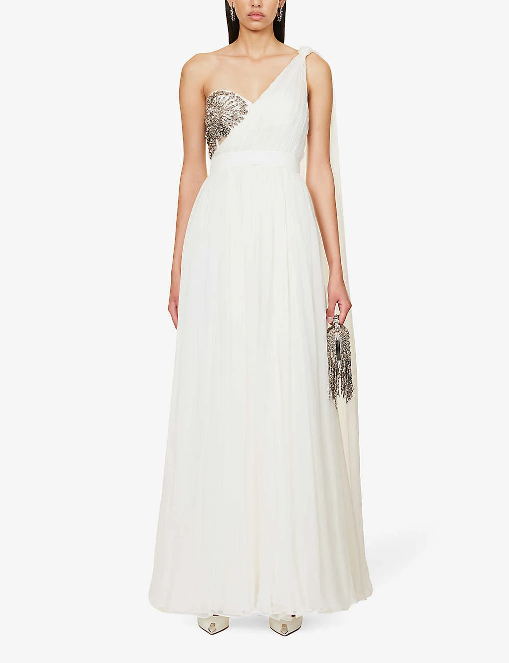 - Slim fit, asymmetric neckline, one shoulder, knotted design at shoulder, padded cups, corset boning, embellished bodice, structured waist, draped design, flared hem