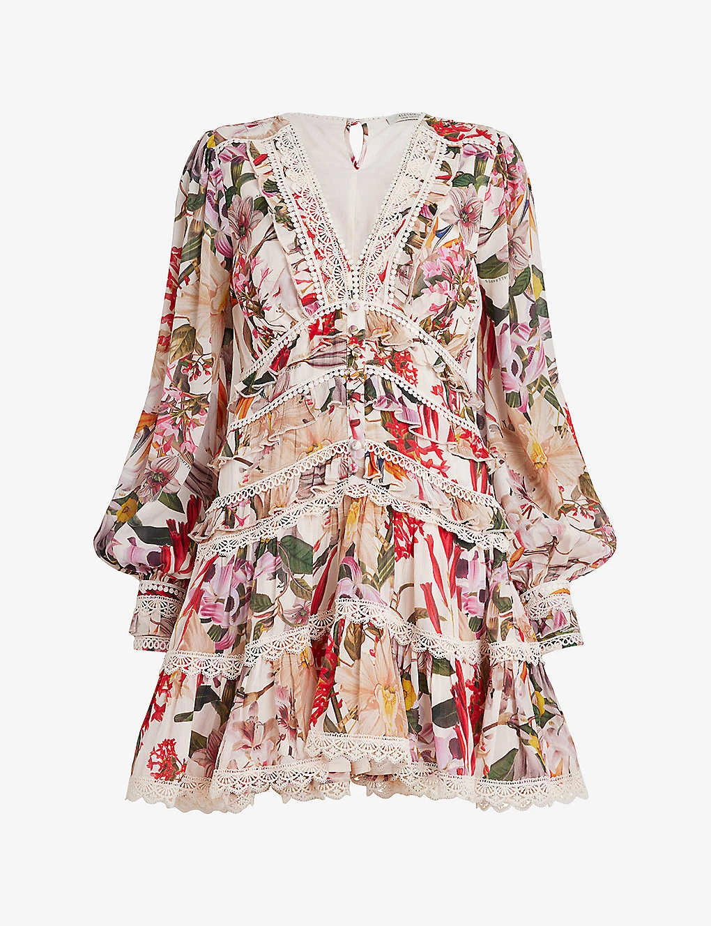 - V-neckline, long sleeves, lace-trim at the neckline, floral-print throughout, tiered skirt, lace-trim hem, mini silhouette, shirred panel at the back