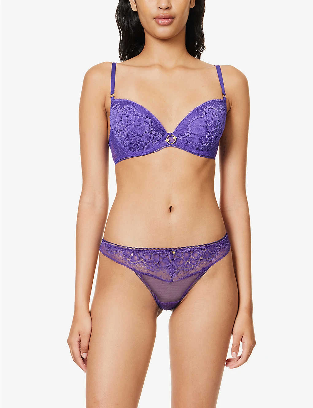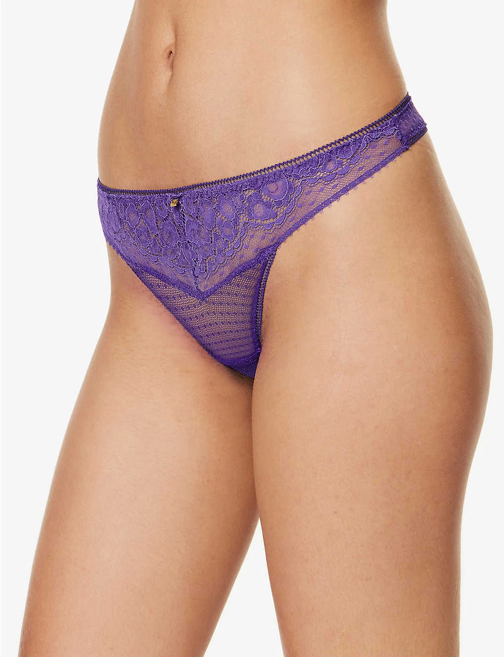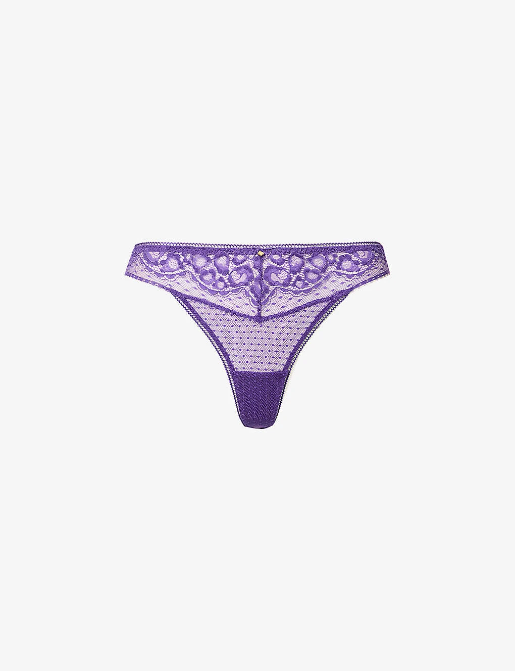 - Mid-rise, elasticated waistband, gold-toned charm at front and back, lace panels, cut-out at back, minimal coverage at back, semi-sheer