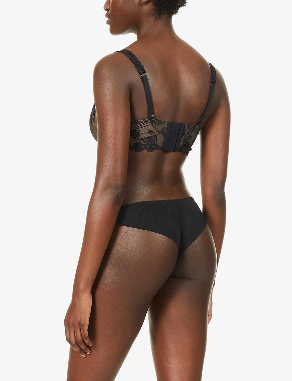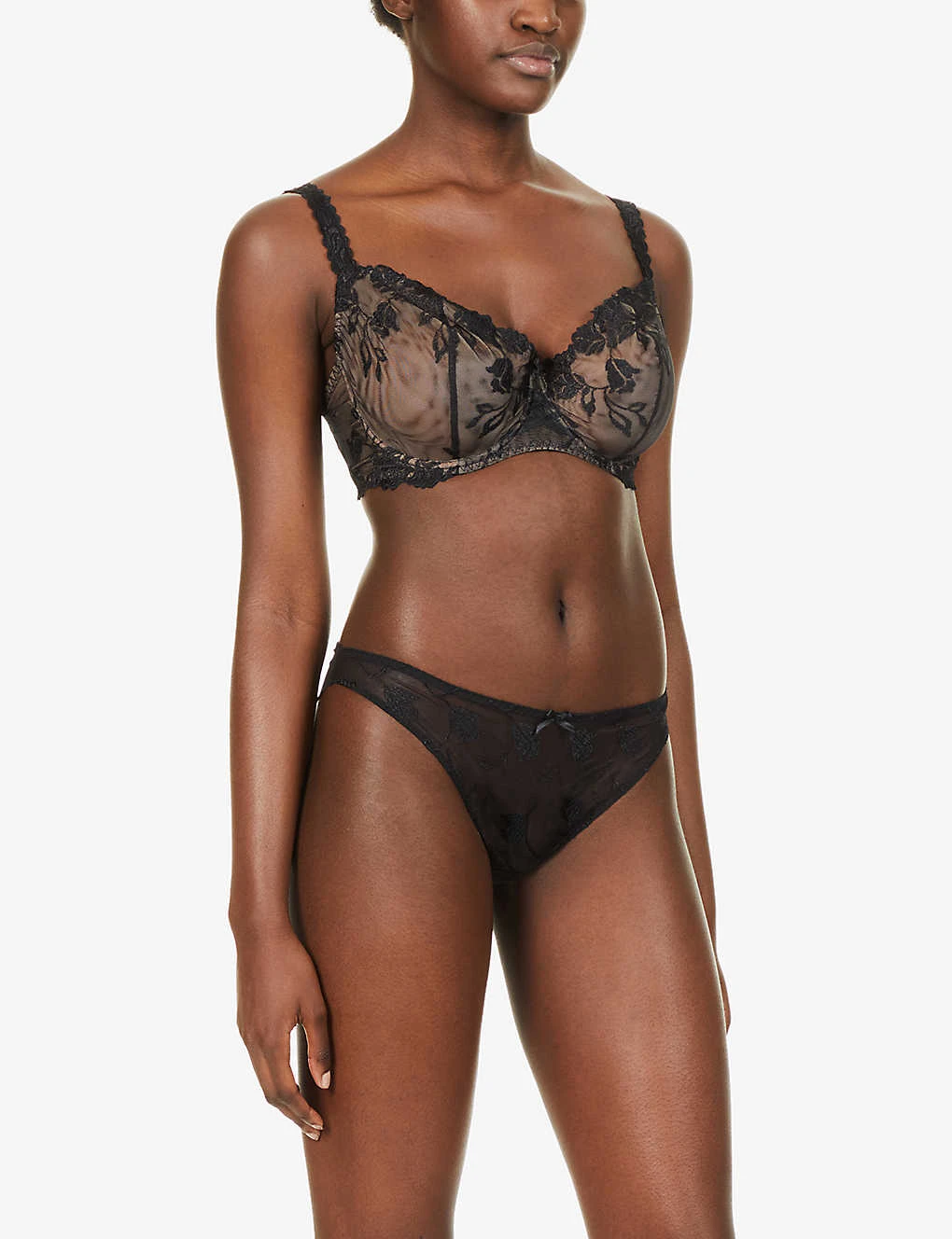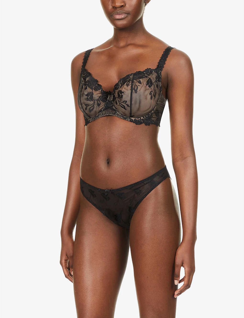 - Half-cup silhouette, adjustable shoulder straps, floral embroidery at mesh, semi-sheer