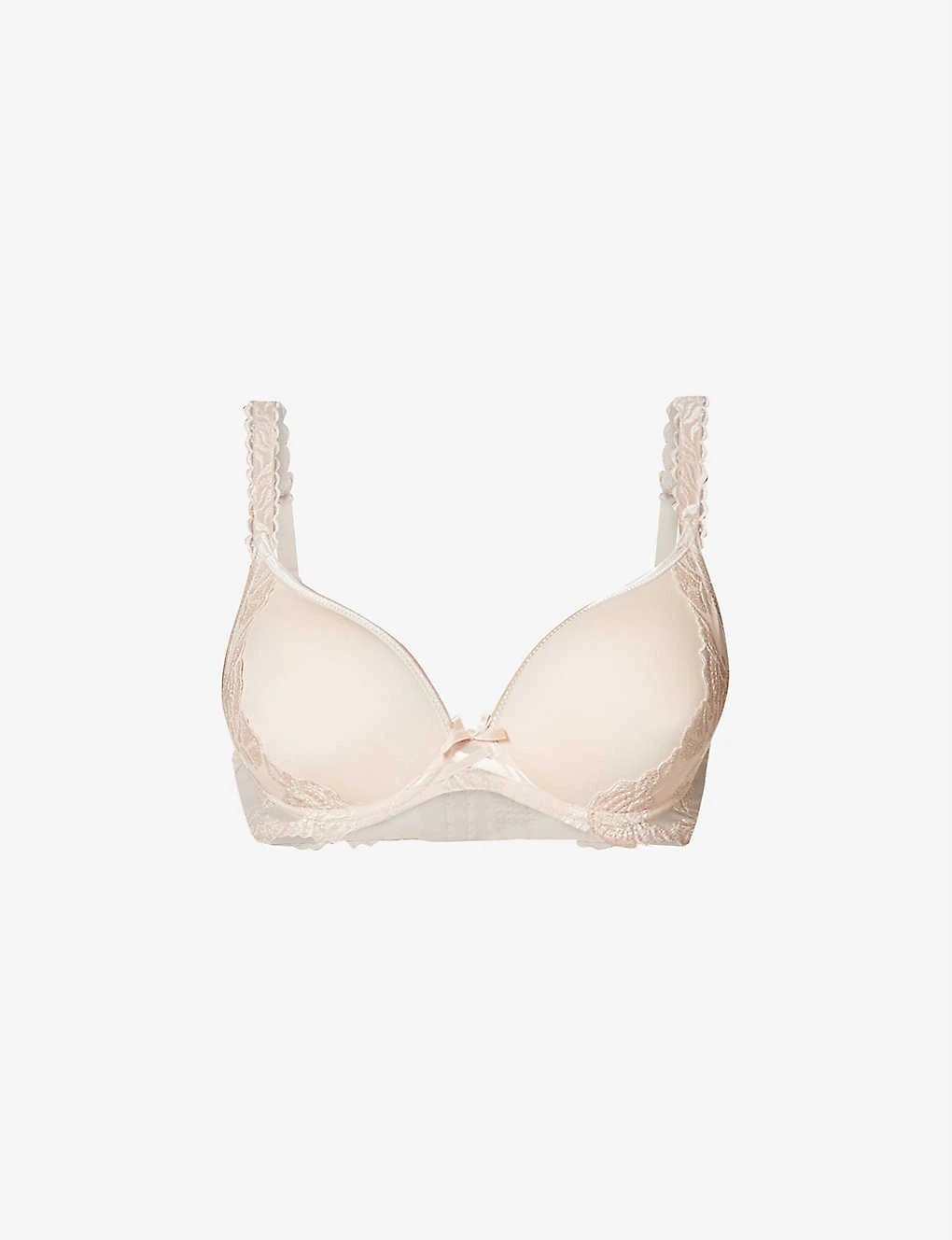 - Adjustable shoulder straps, picot trims at shoulder straps, soft moulded cups with underwiring, embroidered bow at bridge, all-over embroidered floral appliques, semi-sheer mesh wings, scalloped trims