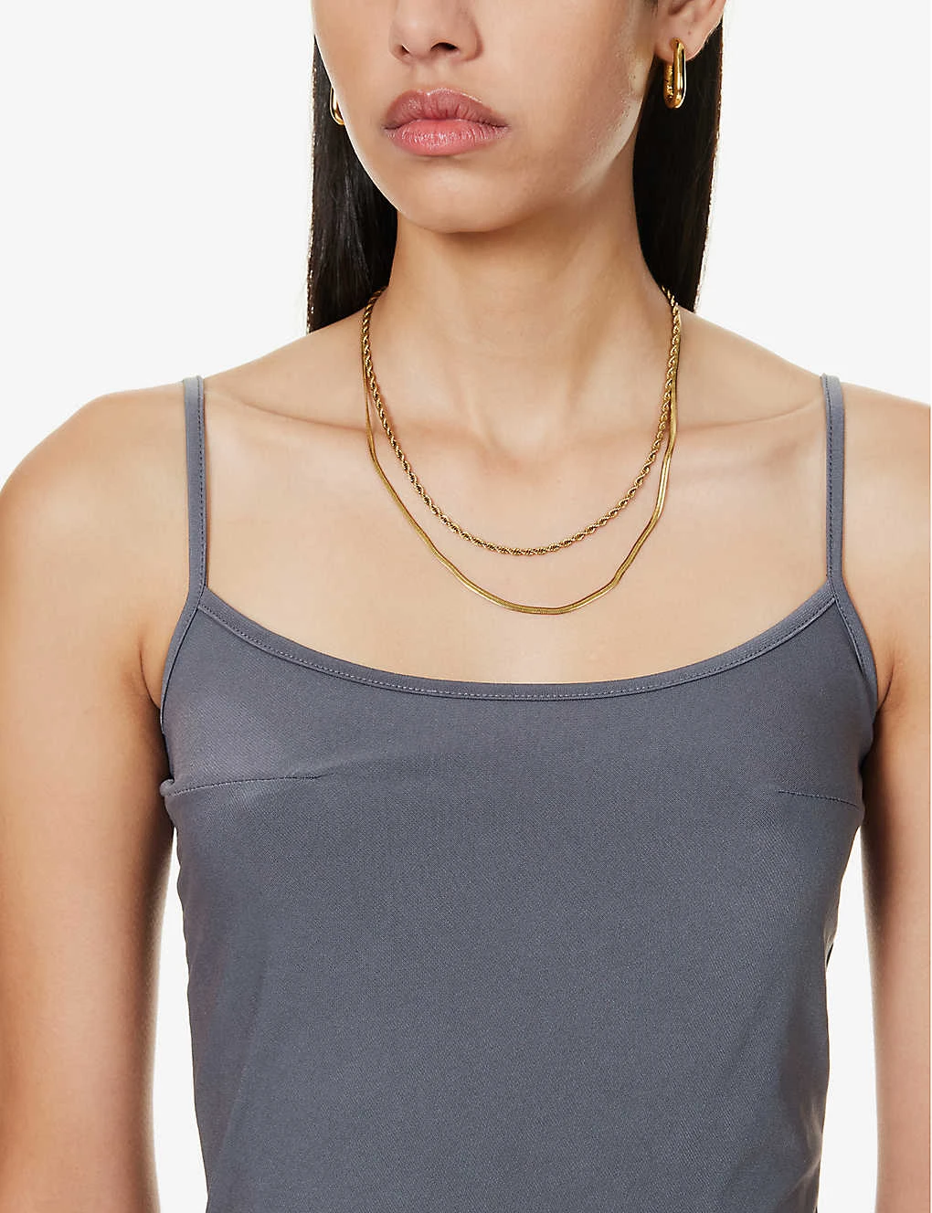 - Slim fit, scoop neckline, sleeveless, adjustable straps, darts at chest, jersey texture, flared hem