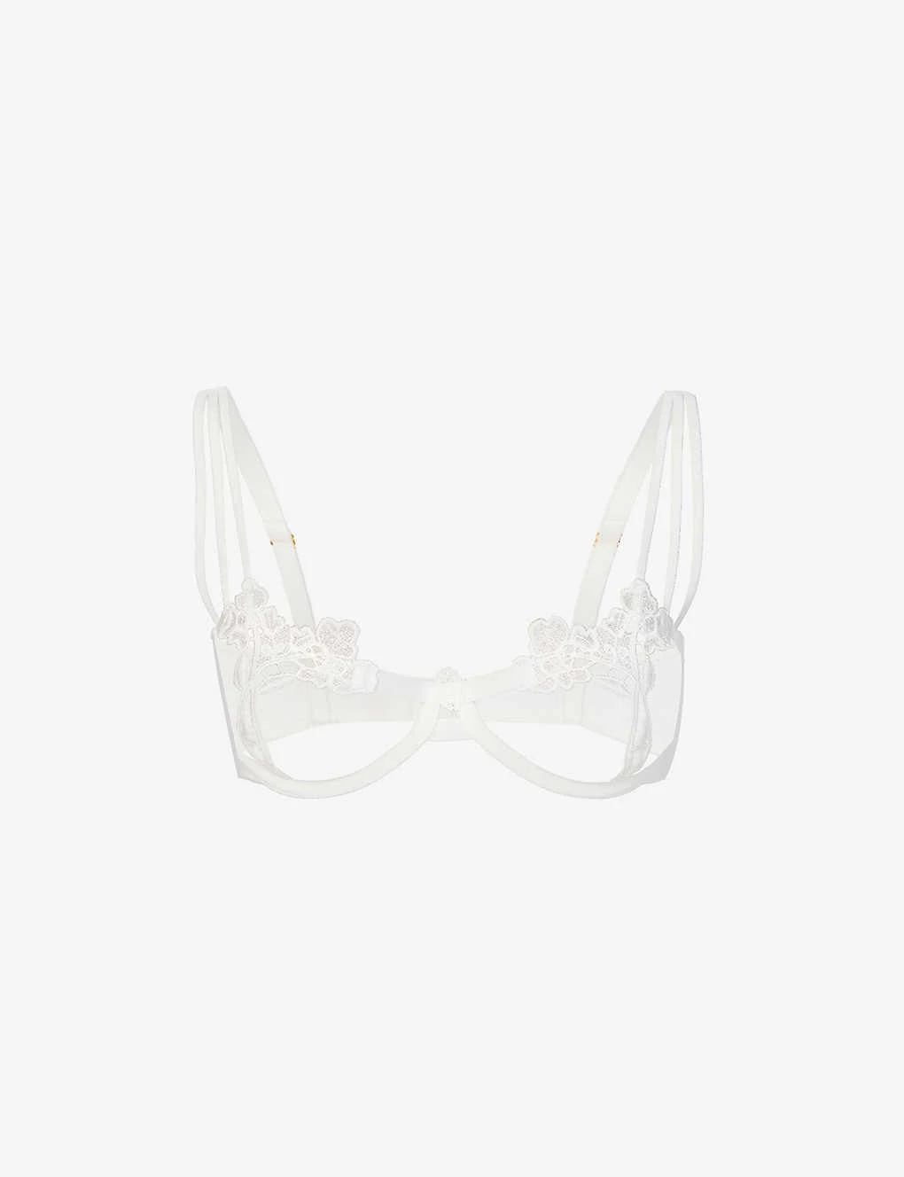 - V-neck, adjustable shoulder straps, three-straps at front, semi-sheer, floral appliqué at cups, underwired cups, gold-toned hardware, tonal stitching