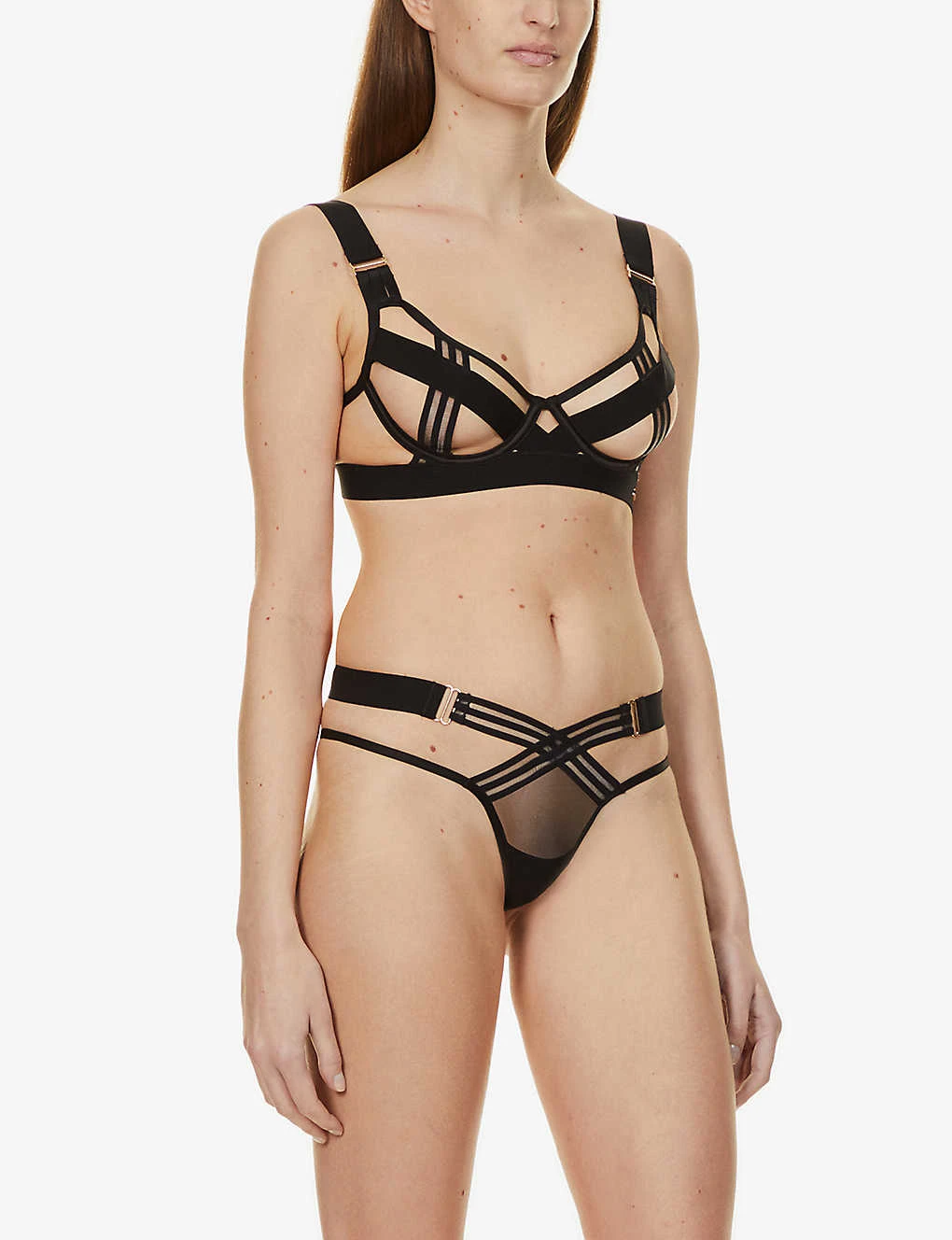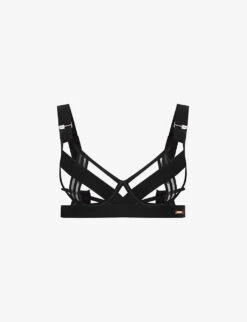 - V-neck, adjustable shoulder straps, gold-toned hardware, open cups, elasticated under band, metallic brand plaque at front