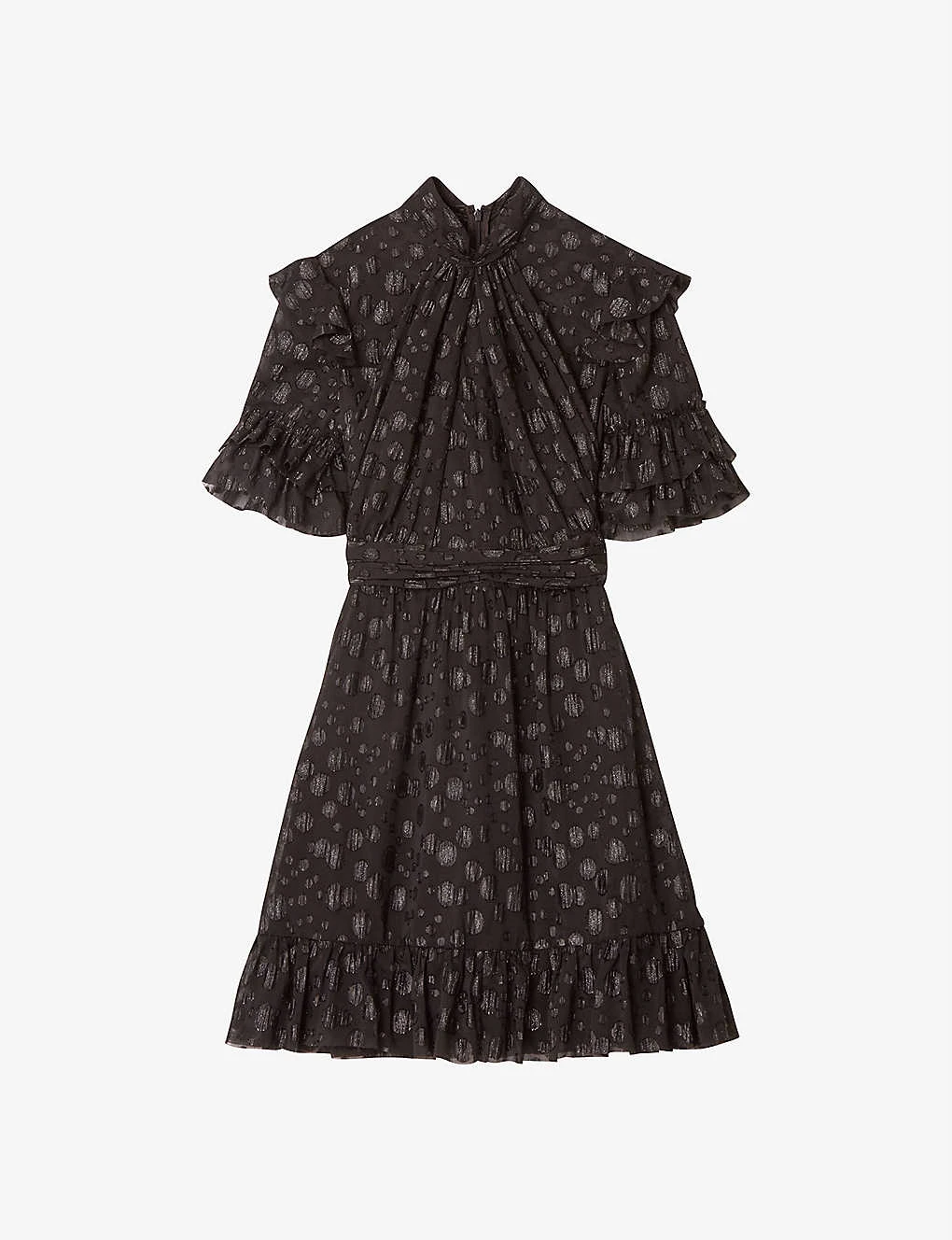 - High collar, short sleeves, all-over polka dot, metallic finish, tiered hem, mini length