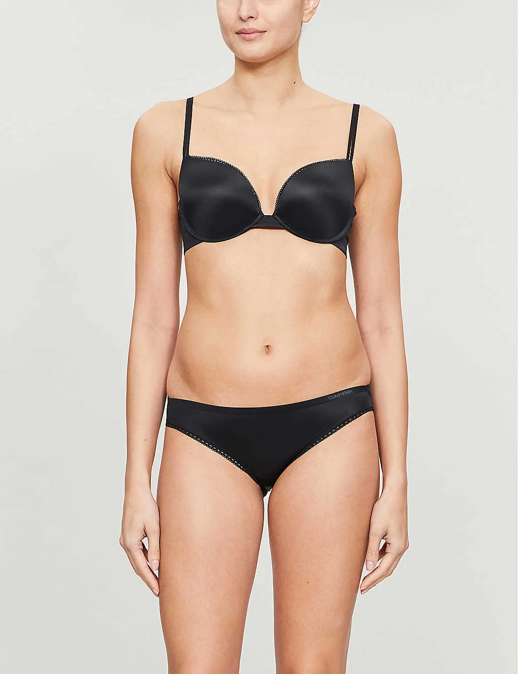 Calvin Klein satin braDetails:Adjustable shoulder strapsMoulded cupsPaddedUnderwiredBranded elasticated wingsPicot trimsConcealed hook-and-eye fastening at backFabric:62% nylon, 38% elastaneMidweight, slight stretchSize & Fit:Cut to a full coverage silhouetteTrue to sizeCare:Hand wash