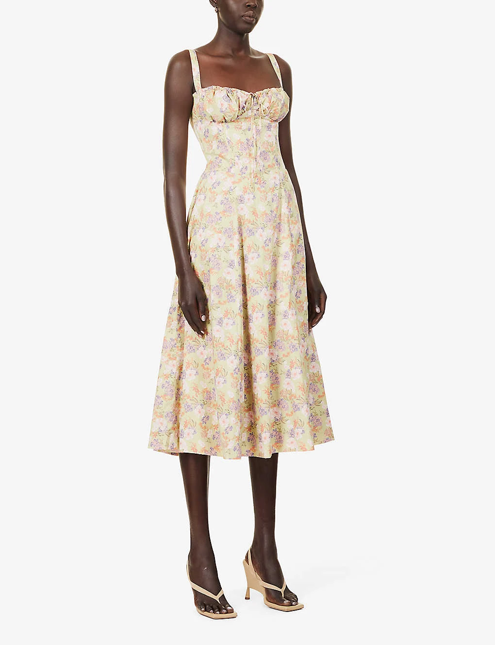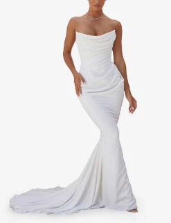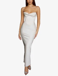 - Slim fit, semi-sweetheart neckline, soft gathered cups, sleeveless, keyhole at front with self-tie, corset bodice, split at front, criss-cross self-tie at back, fully lined