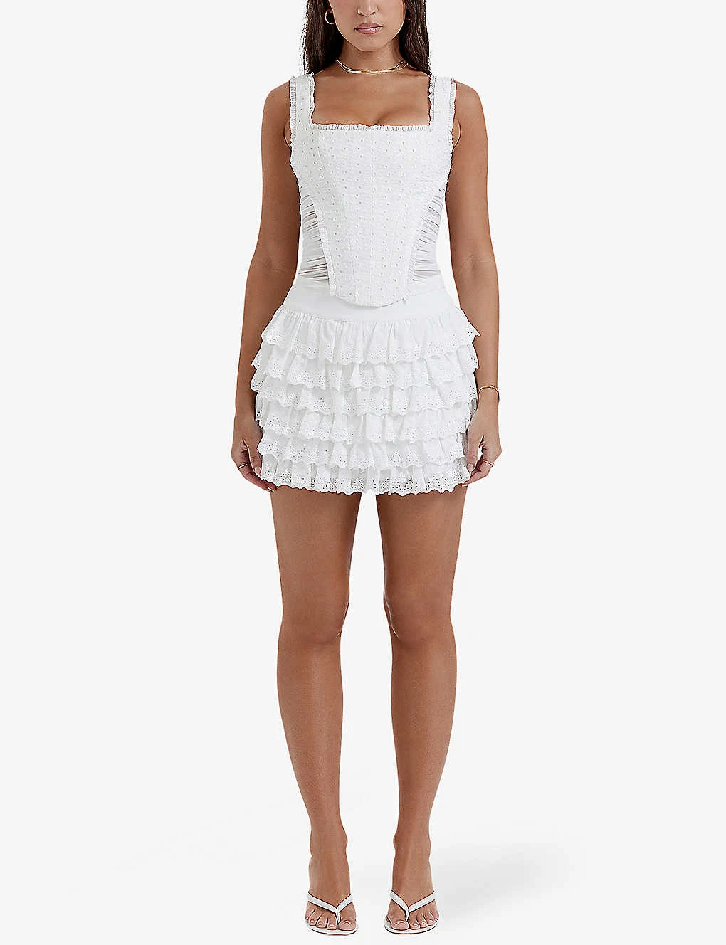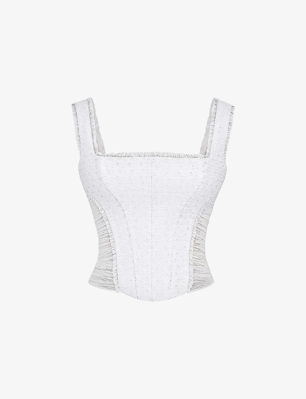 - Fitted, thick shoulder straps, square neckline, internal boning, broderie anglaise embroidered panel at front and back, gathered panel at sides, fully lined