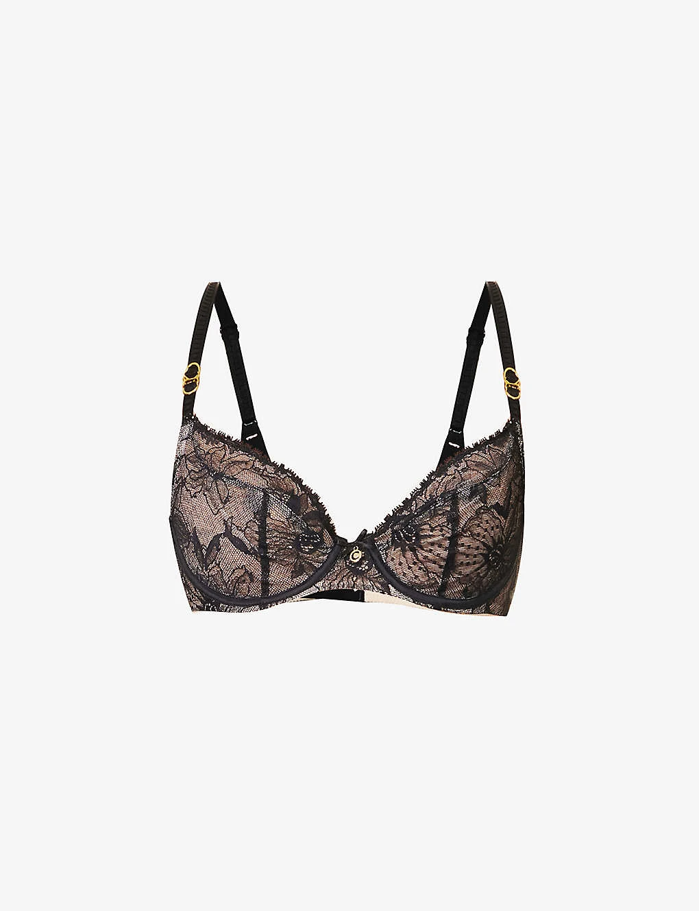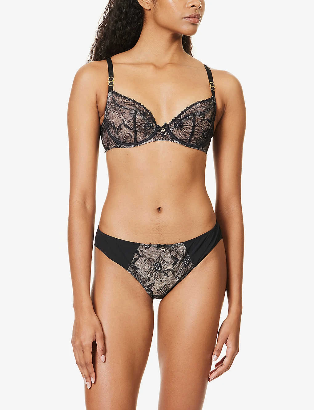 - Adjustable shoulder straps, sweetheart neckline, soft moulded cups, underwire, brand design plaque at front, all over lace embroidery