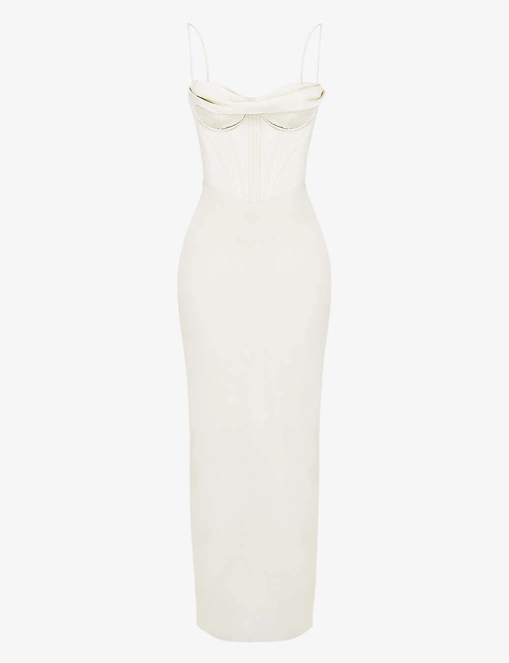 - Slim fit sweetheart neckline, cowl overlay at neck, underwired cups, soft padding at cups. sleeveless, adjustable straps, corset bodice, split at back, fully lined