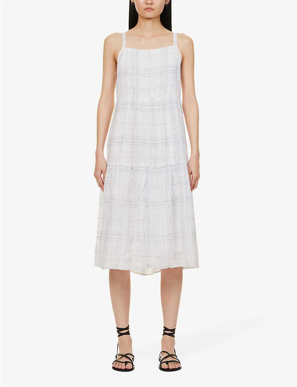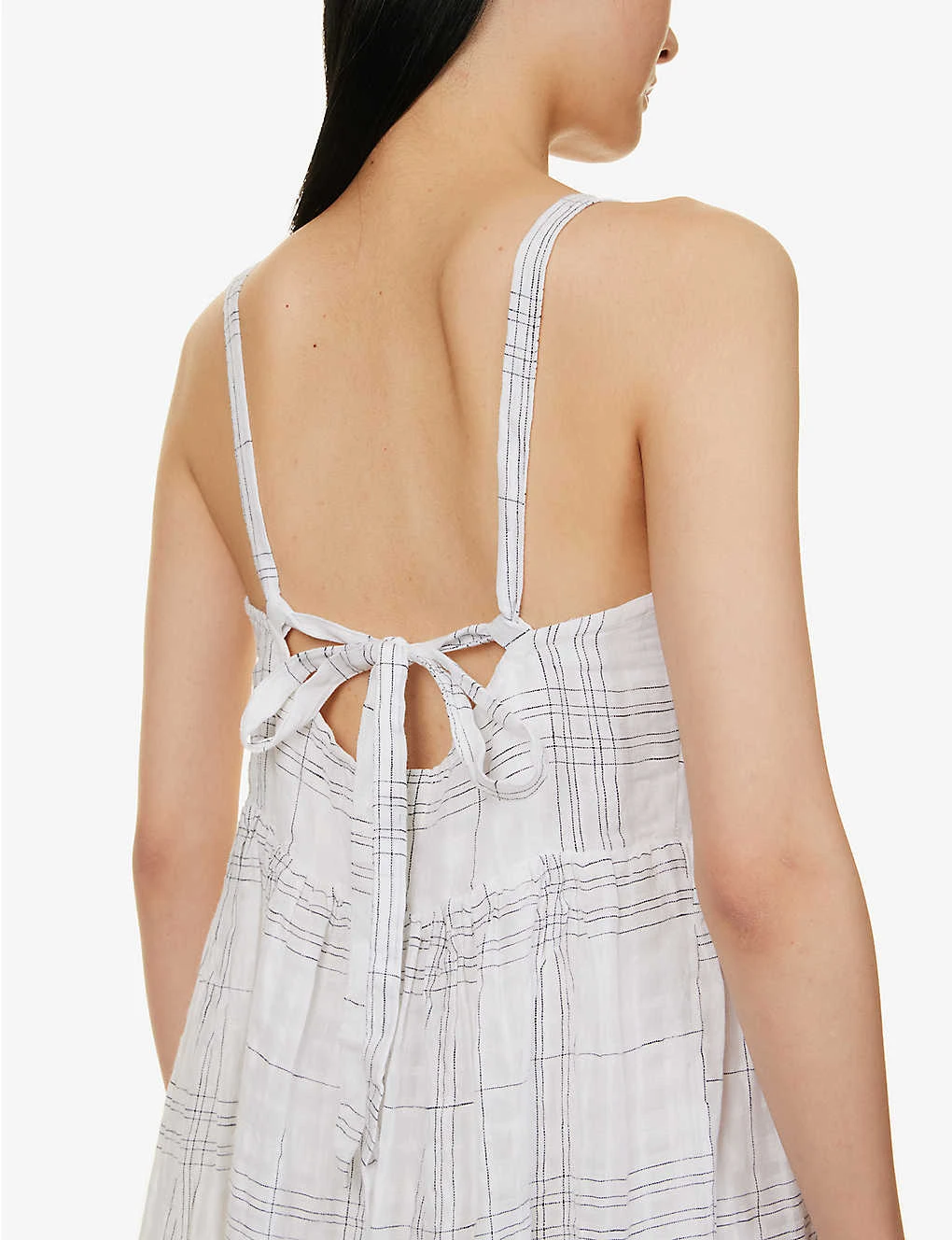 - Regular fit, square neckline, sleeveless, self-tie straps, all-over check pattern, flared hem