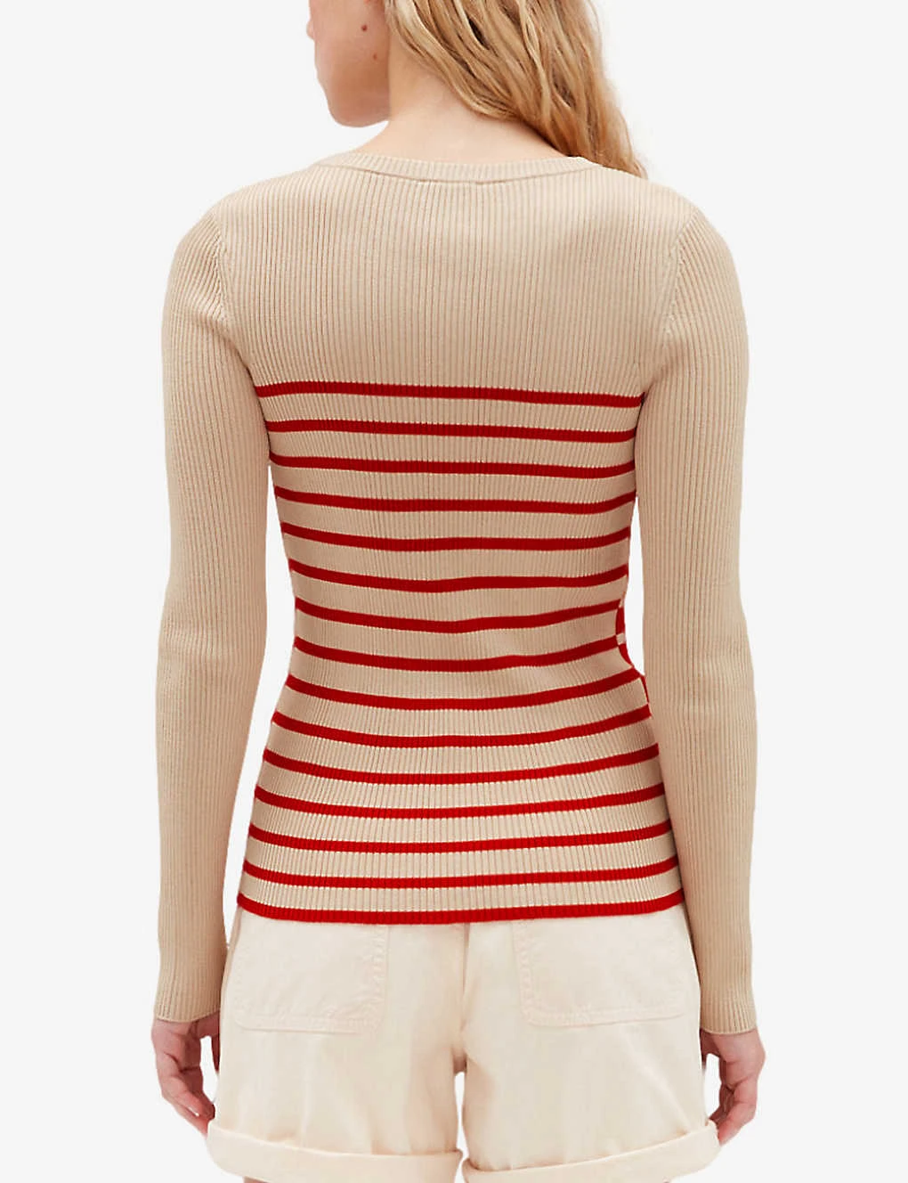 - Round neck, long sleeves, ribbed detail, stripe pattern, form fitting silhouette