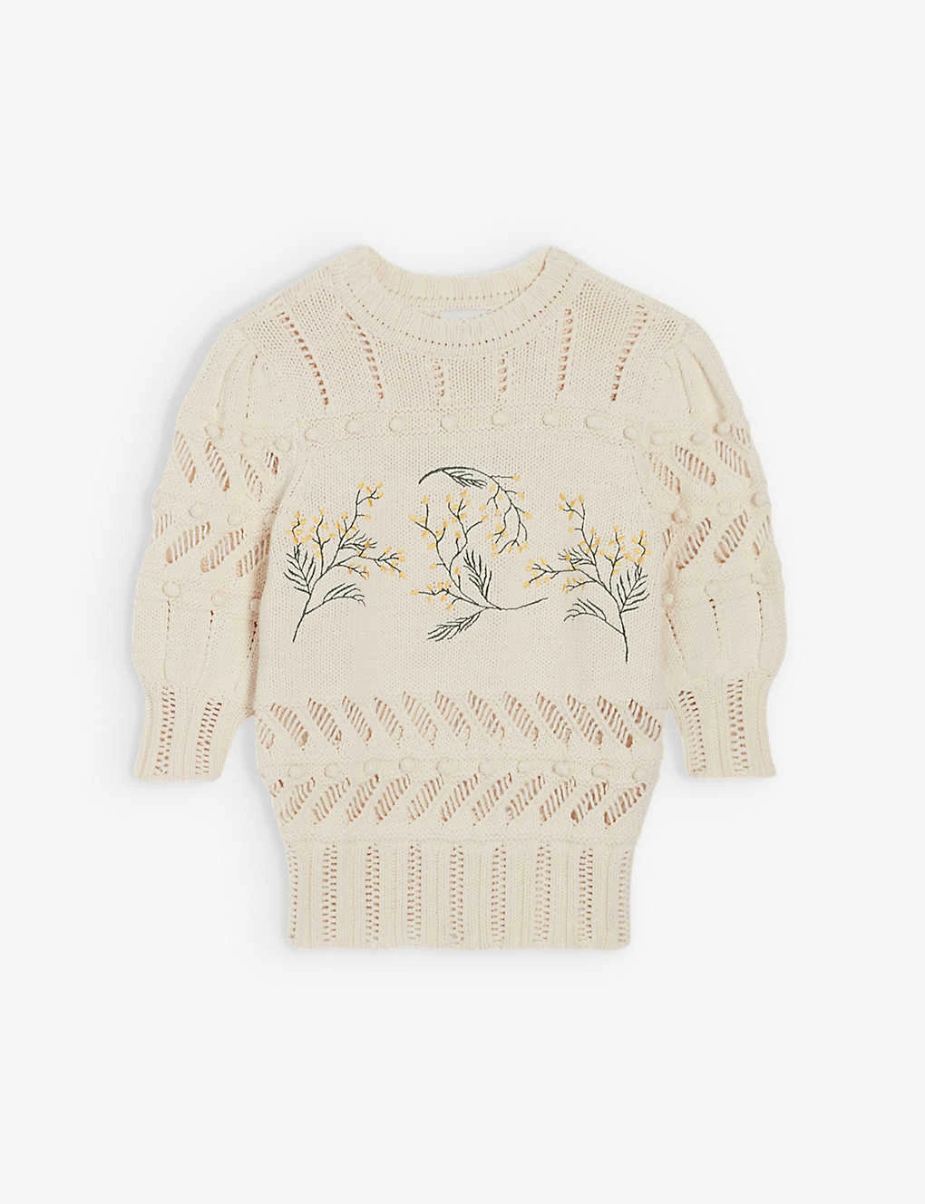 - Relaxed fit, round neck, three-quarter-length-sleeves, embroidered motifs at front, all-over open work crochet panels, ribbed trims