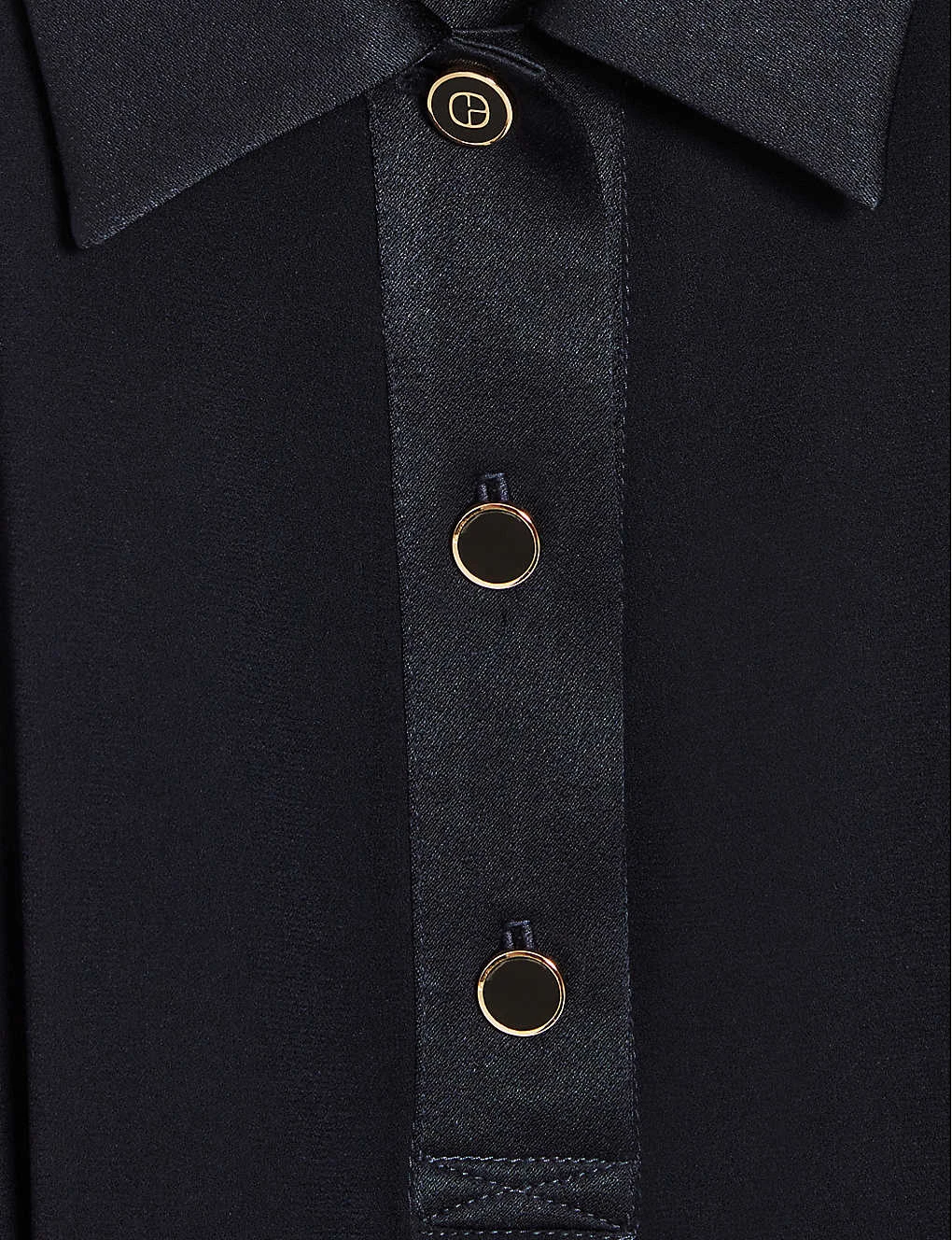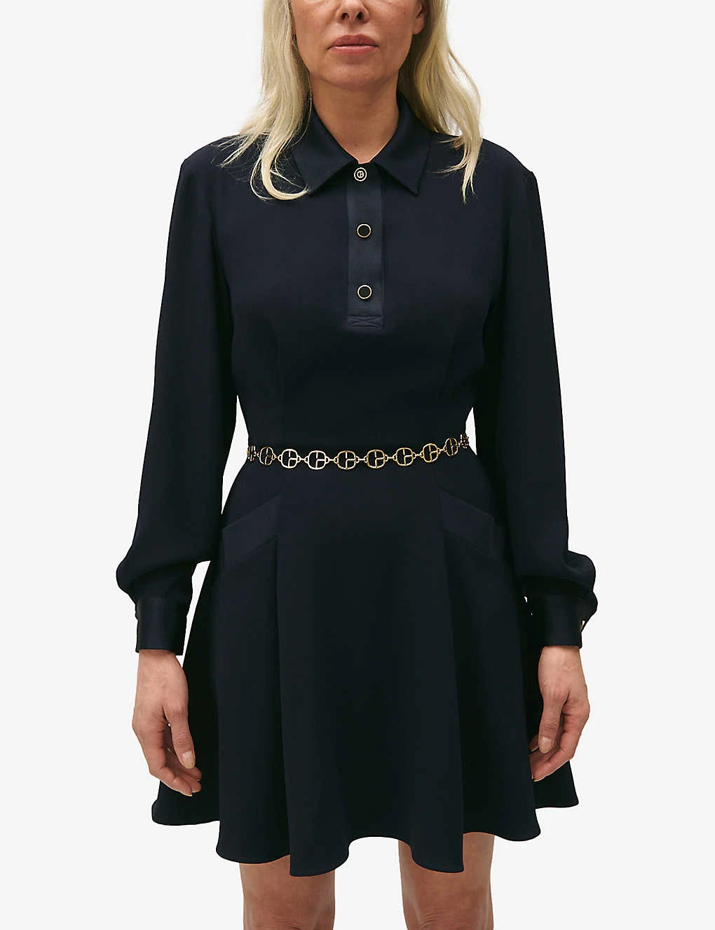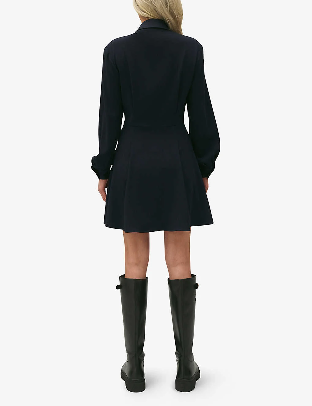 - Fit-and-flare, collar, exposed button placket at front, long sleeves, buttoned cuffs, fitted waistband, flared skirt, satin trim, welt pockets at front, straight hem, partially lined
