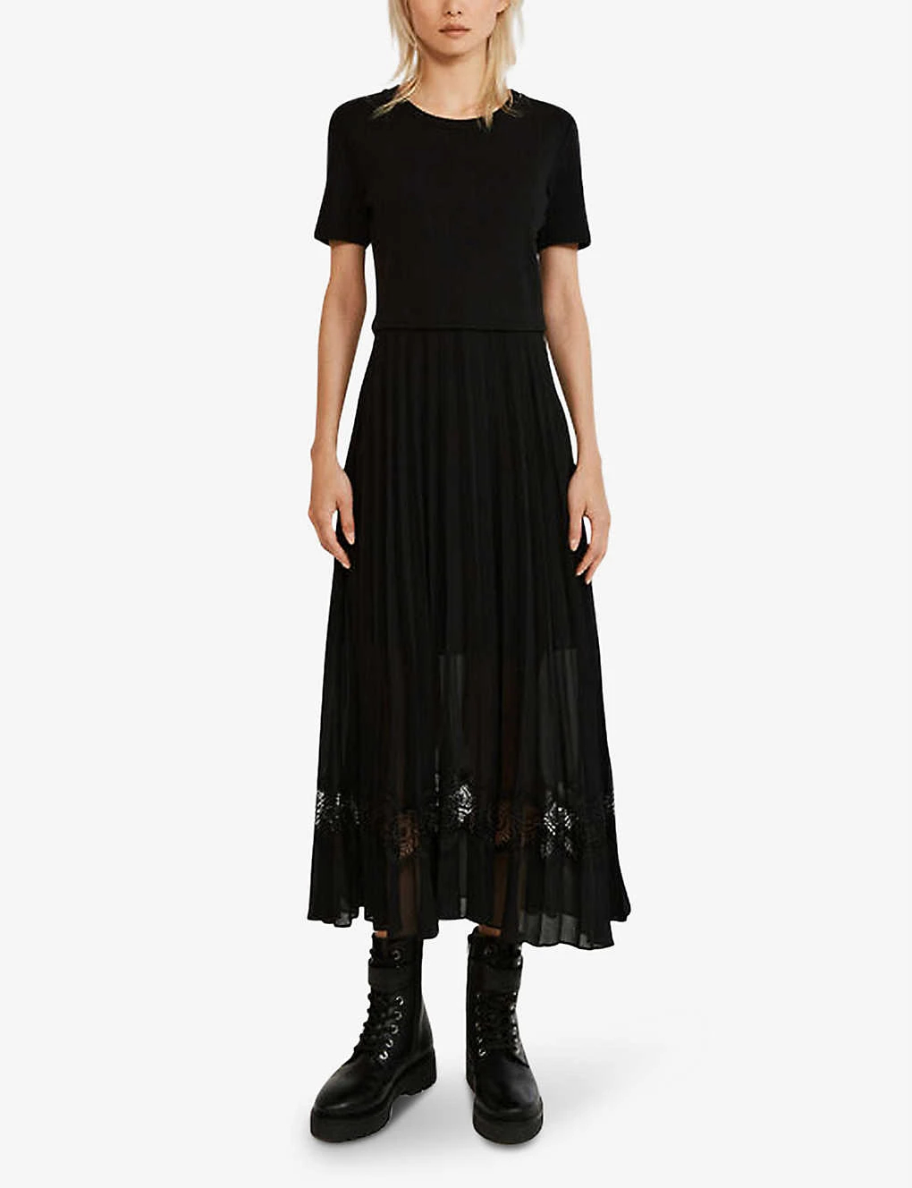 - Round neck, short sleeves, pleated skirt, sheer overlay, lace trim, straight hem, fully lined