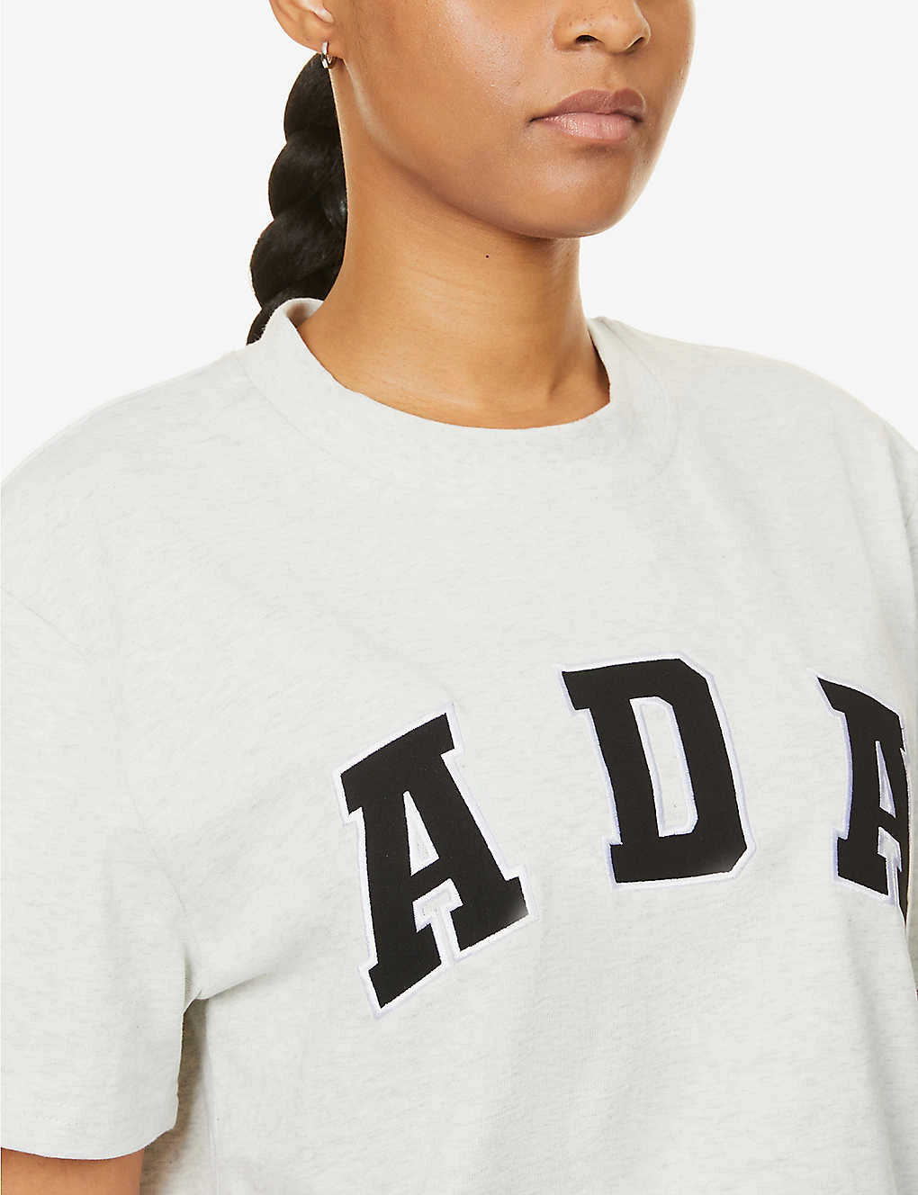 - Relaxed fit, round neck, ribbed trim at neck, short sleeves, contrast brand text embroidered-appliqué at front, all-over marl pattern
