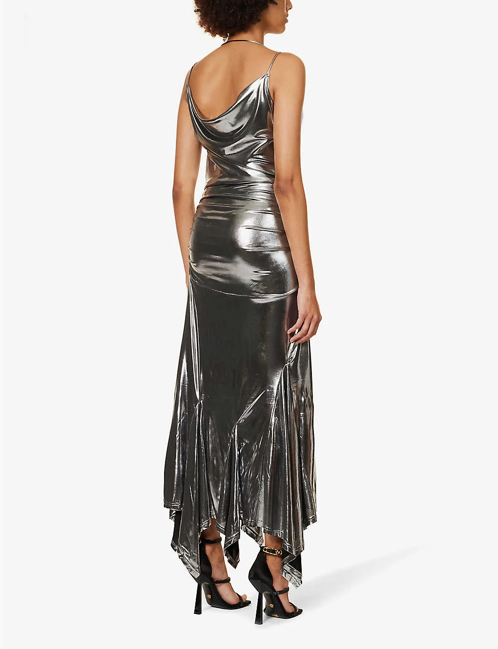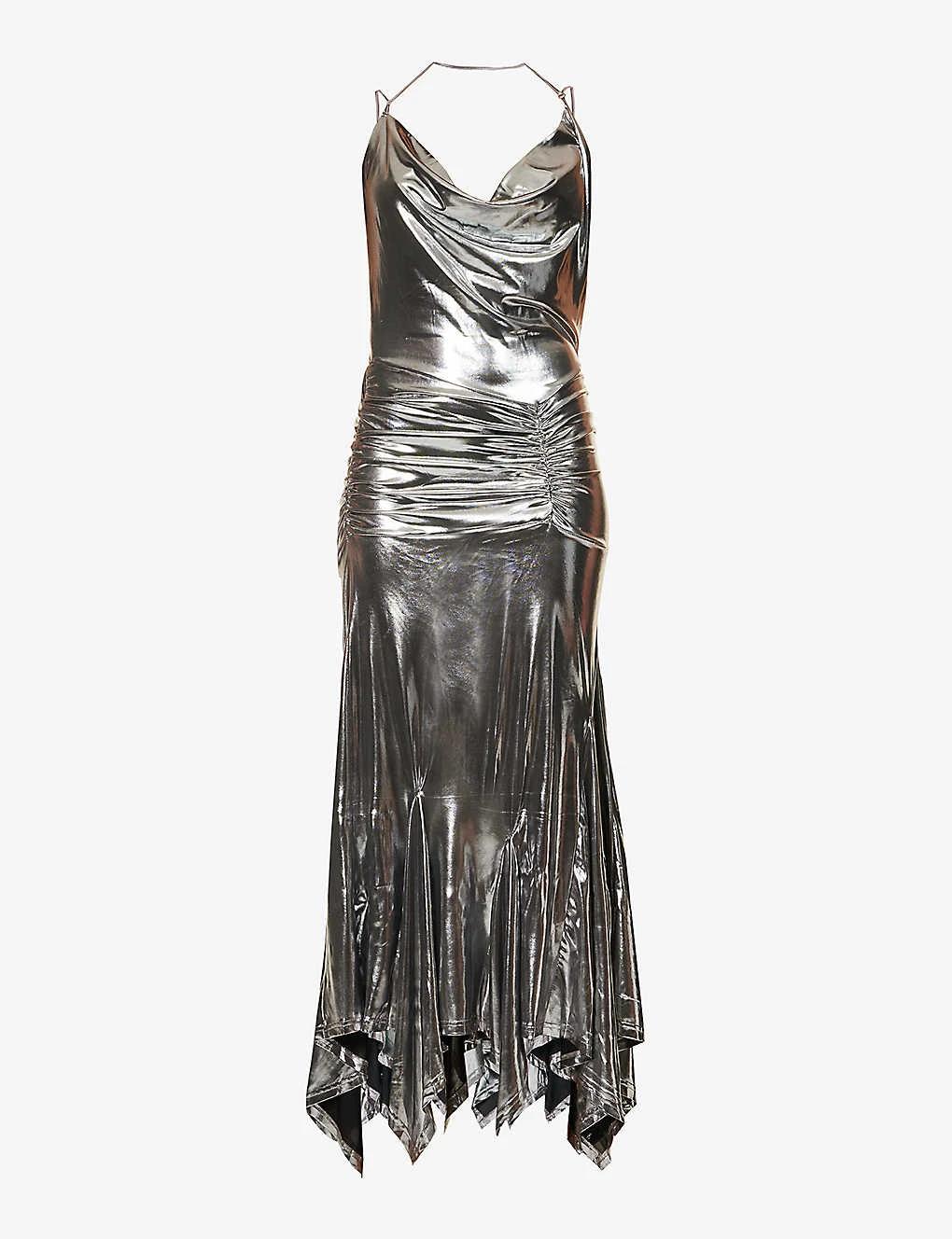 - Slim fit, cowl neckline, sleeveless, ruching at sides, asymmetric hem, metallic finish