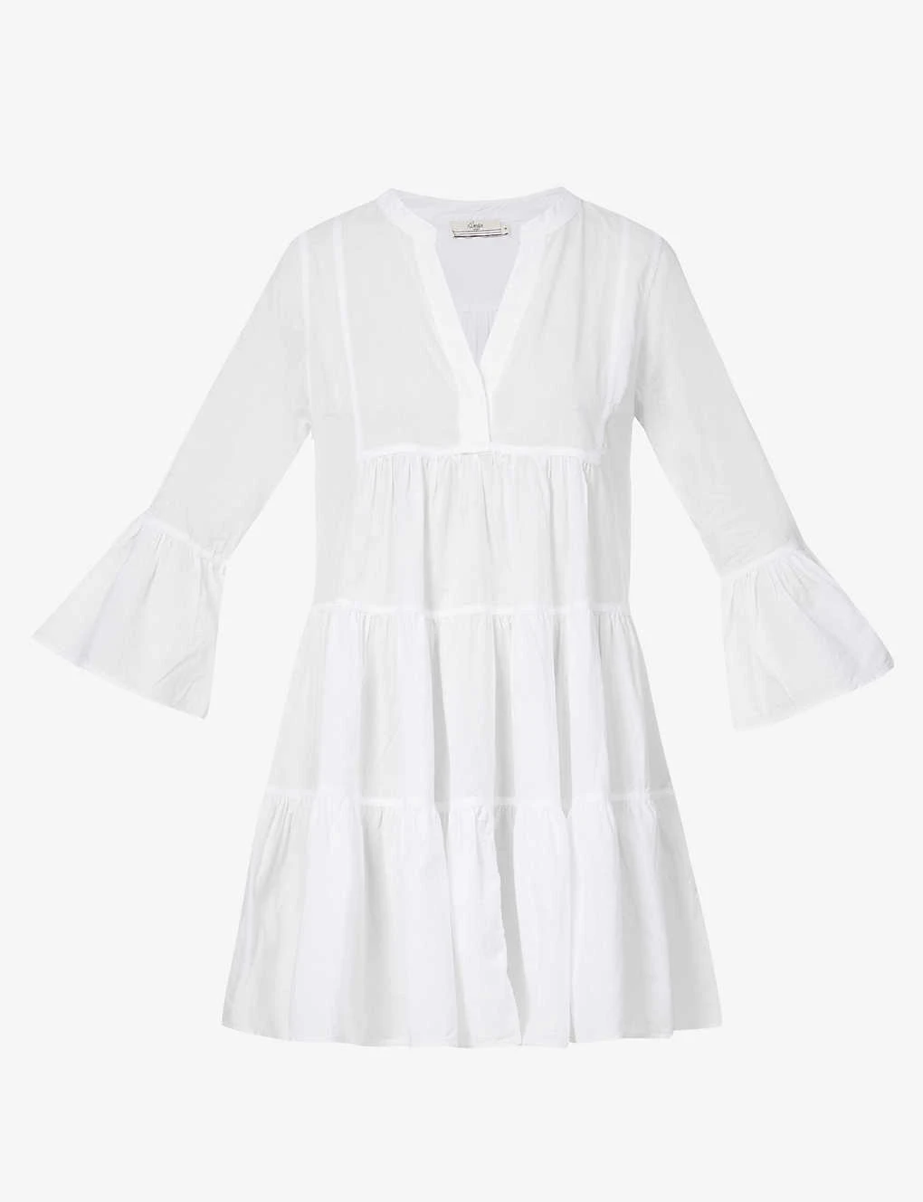 - Relaxed fit, V-neckline, long sleeves, ruffle sleeve hems, tiered flared hem