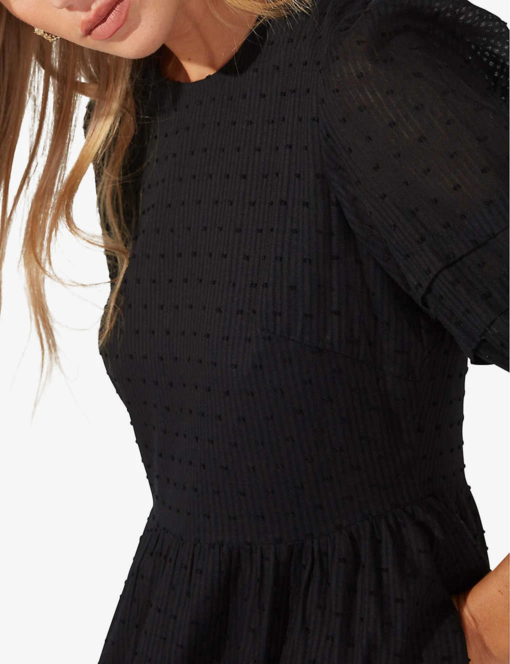 - Regular fit, round neckline, short sleeves, pin-tuck details, tiered hem