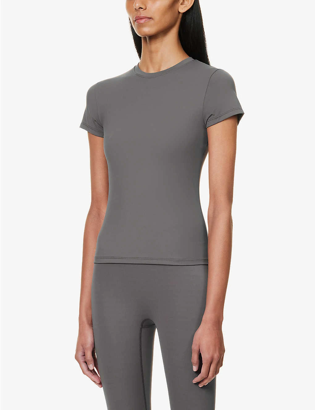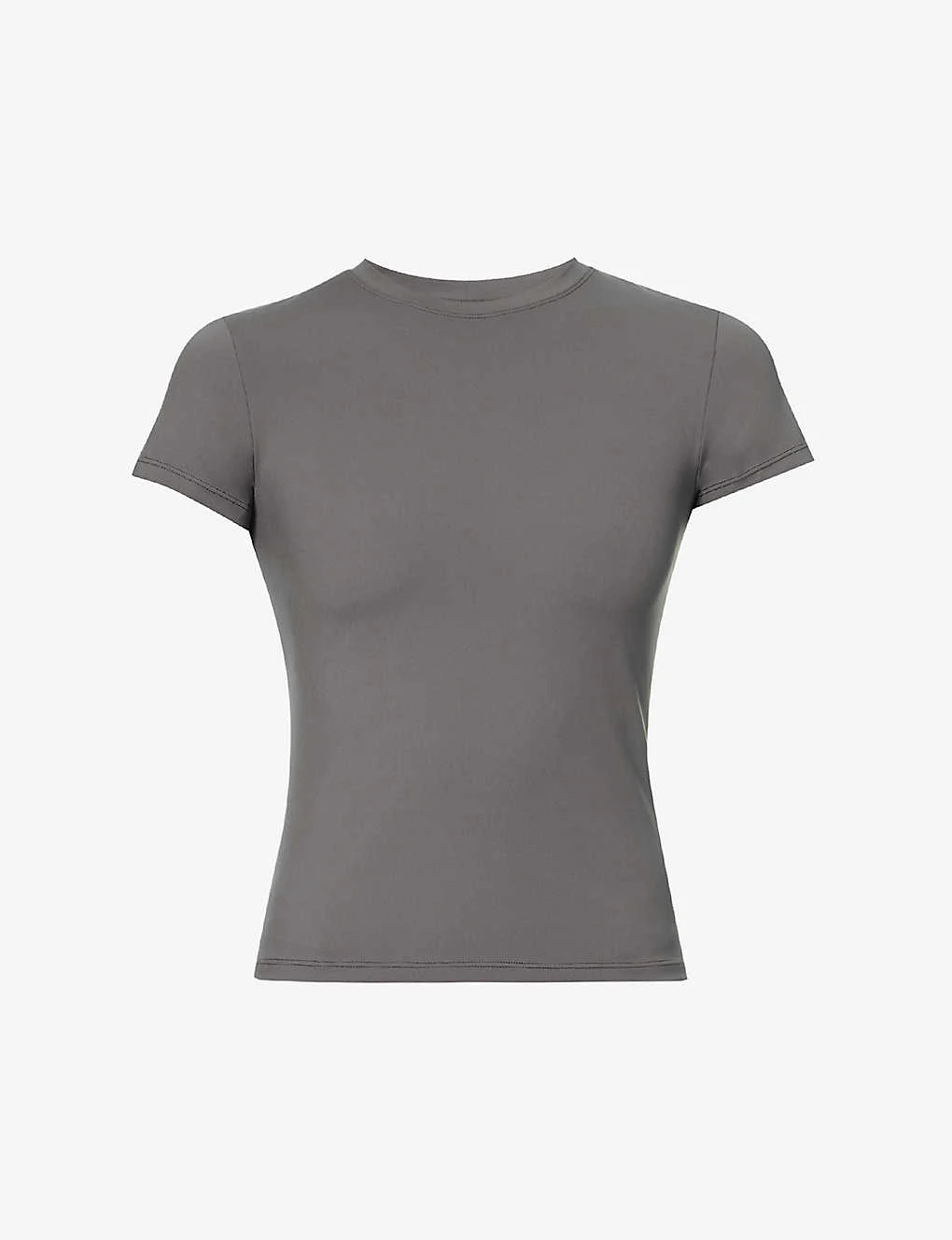 - Fitted, round neck, ribbed trim at neck, short sleeves, branded print at back