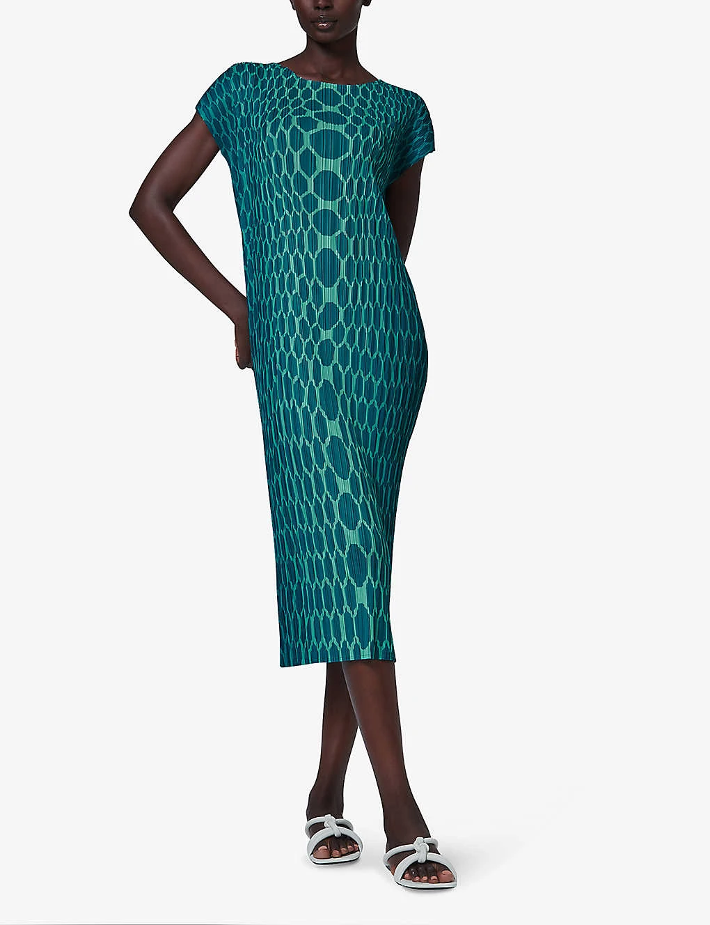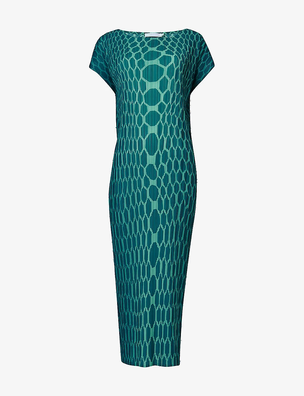 - Straight cut, midi length, short sleeves, round neck, all-over plissé finish, graphic print, straight hem