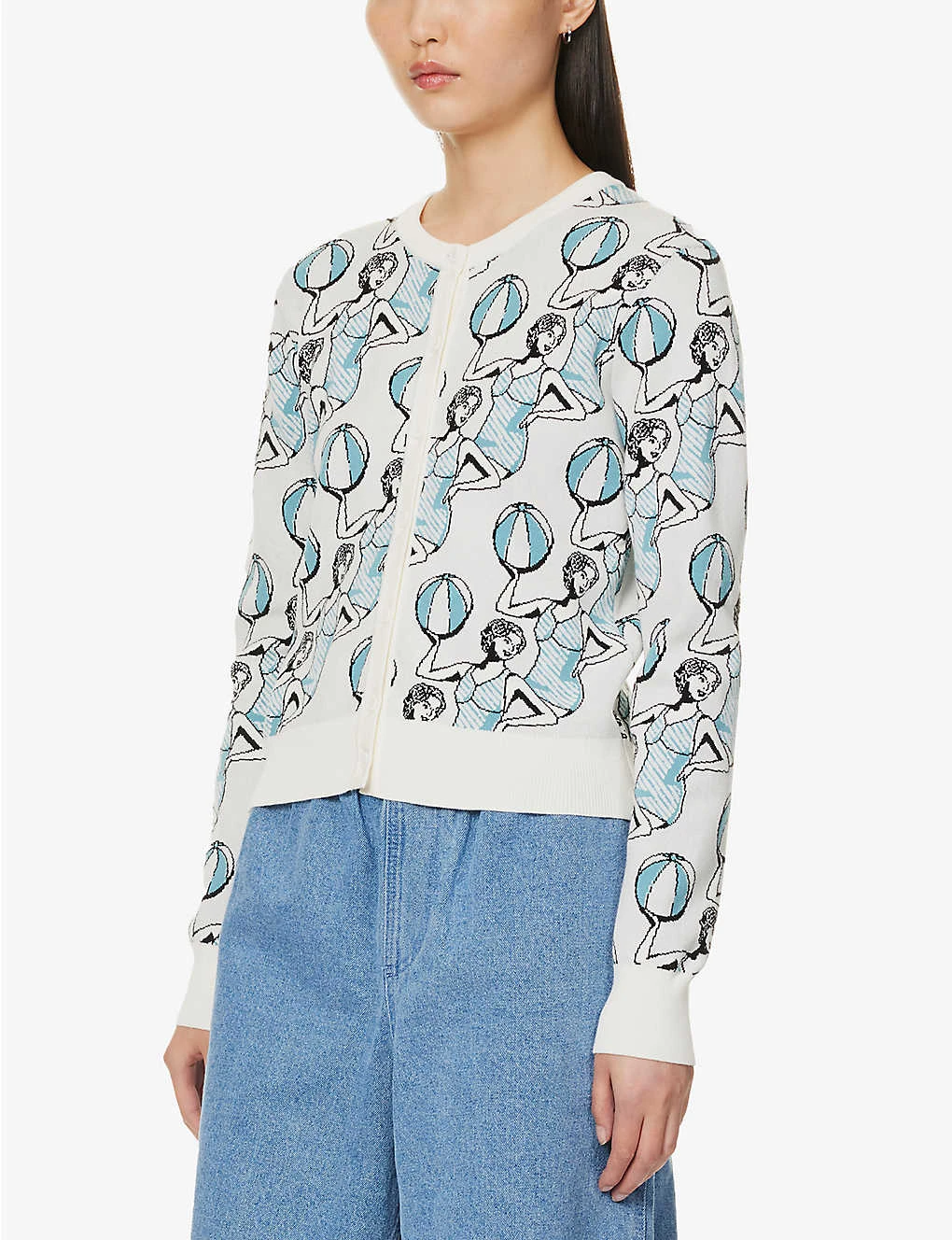 Graphic-print Scoop-neck Knitted Cardigan