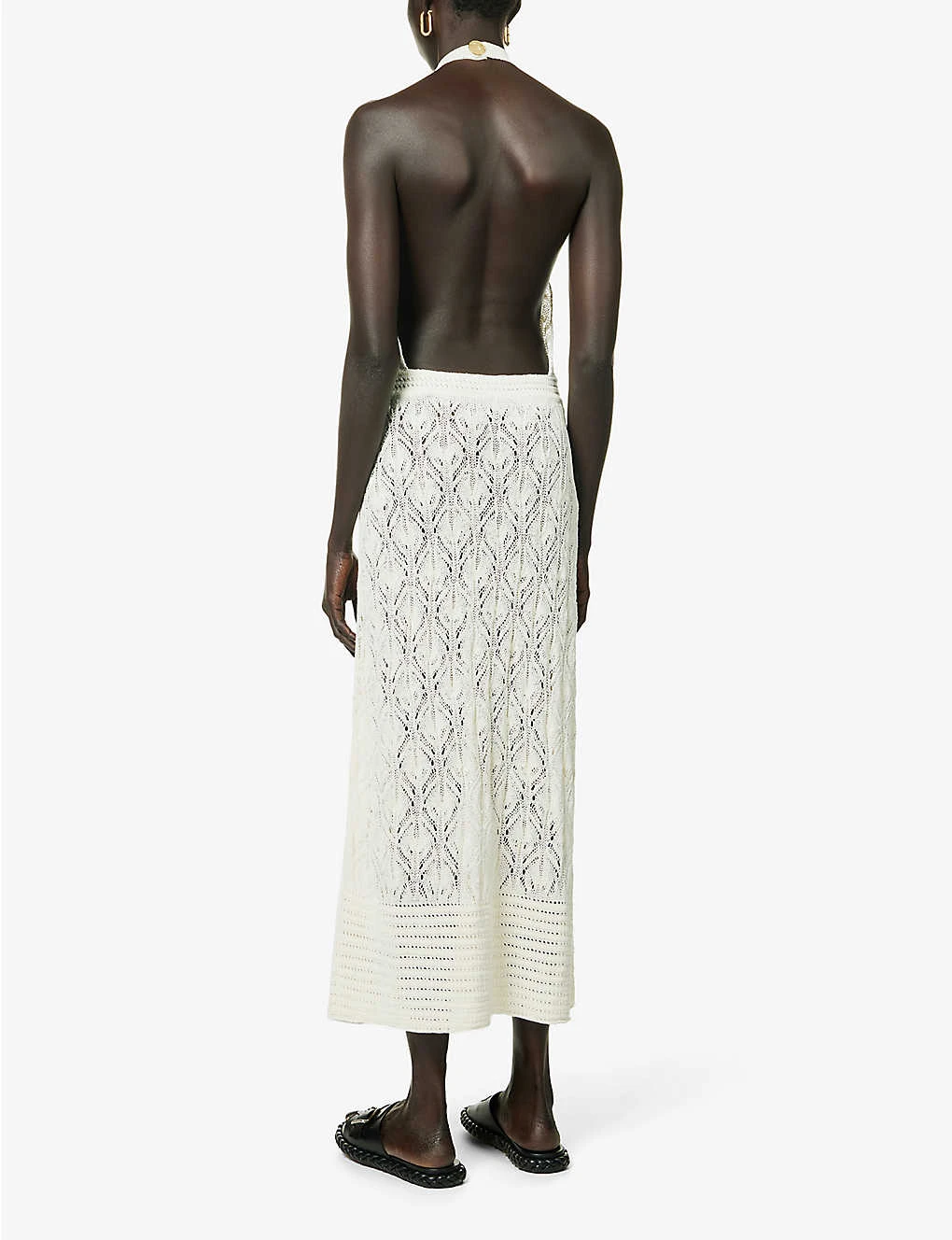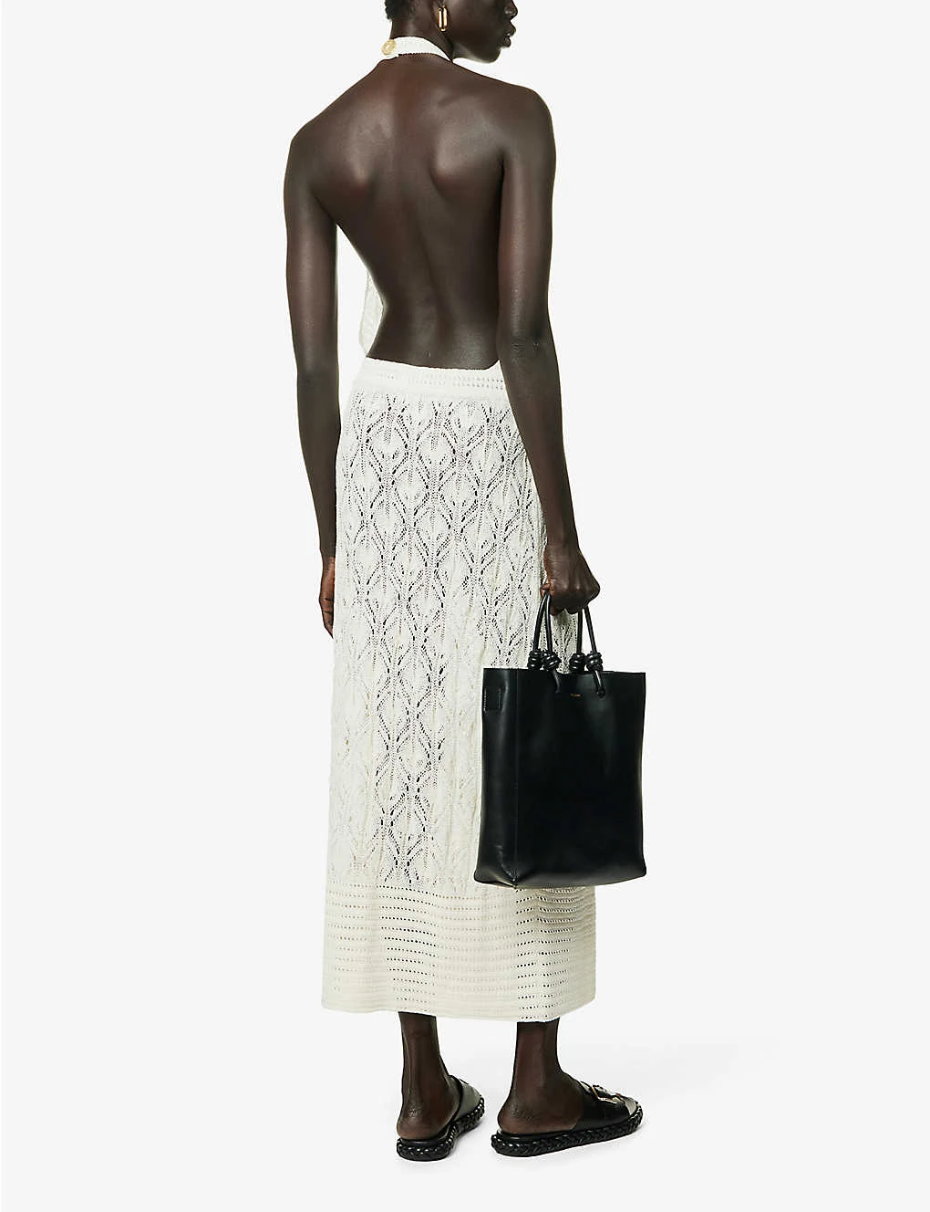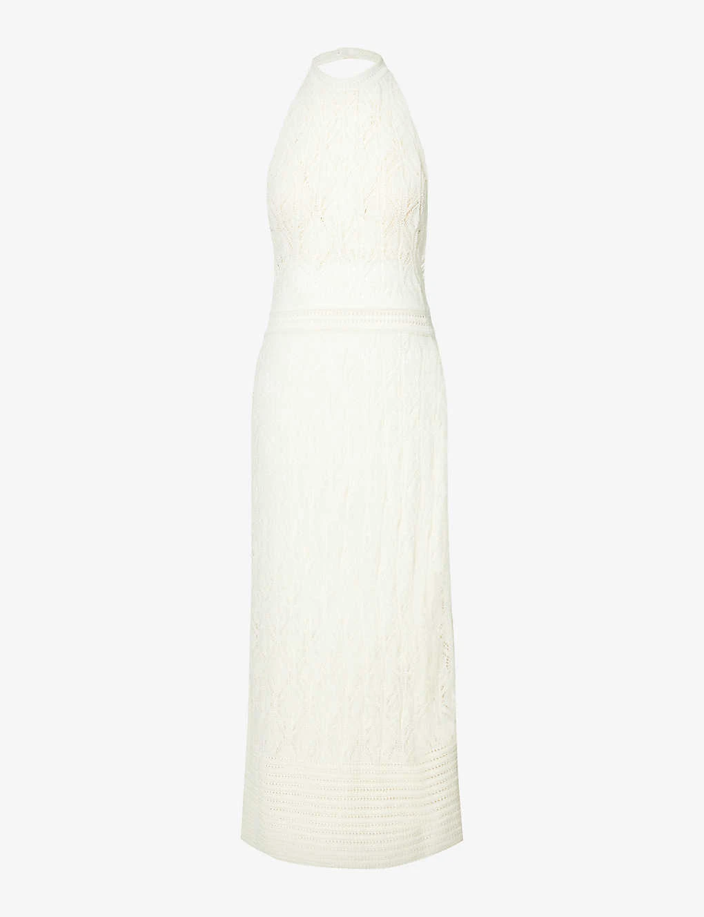 - Regular fit, halterneck, sleeveless, open back, elasticated waist, all-over crochet knit pattern