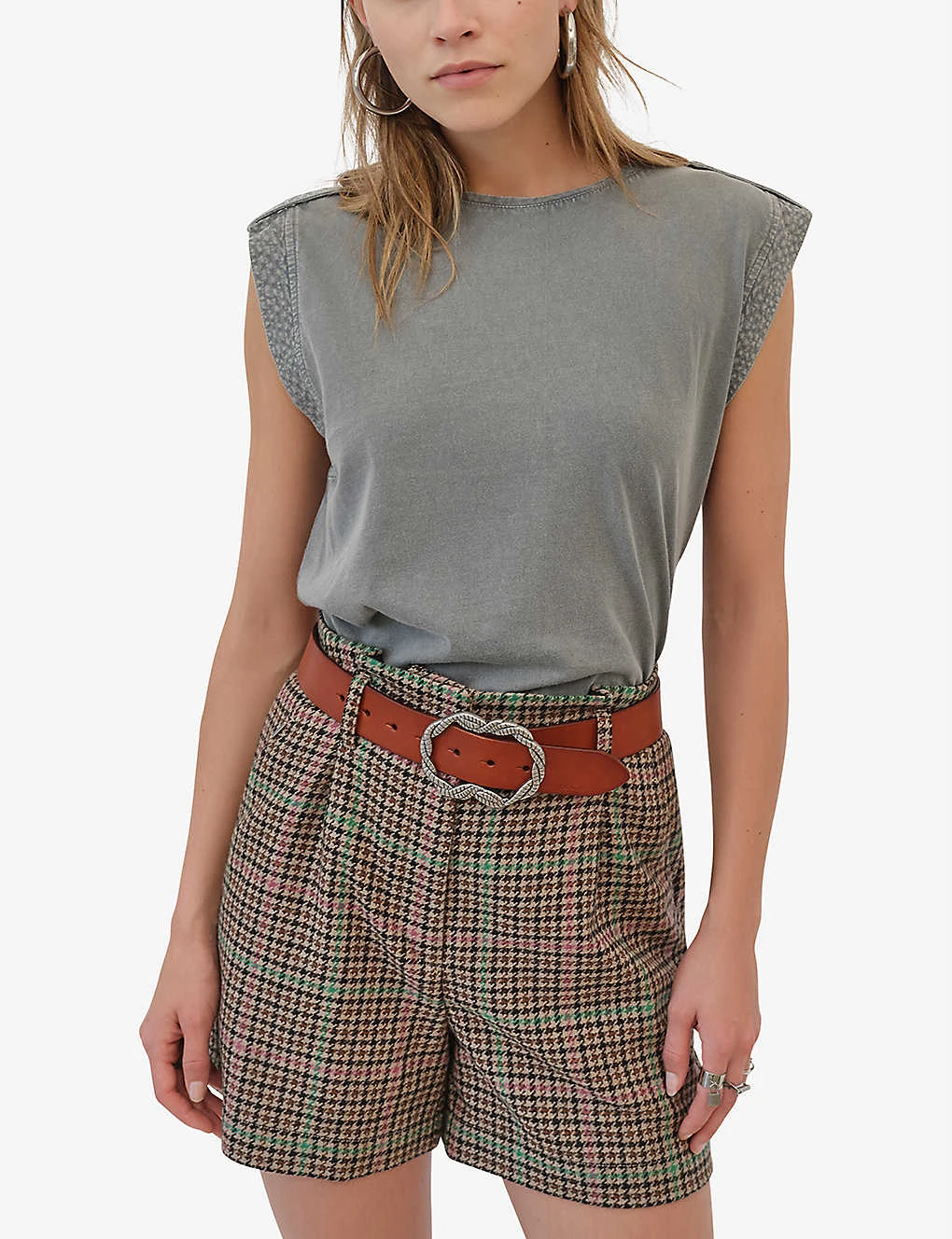 - High rise, all-over checked pattern, detachable belt, side pockets
