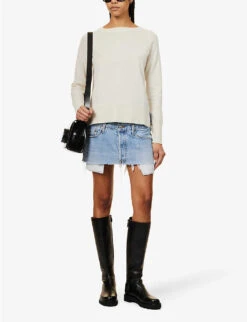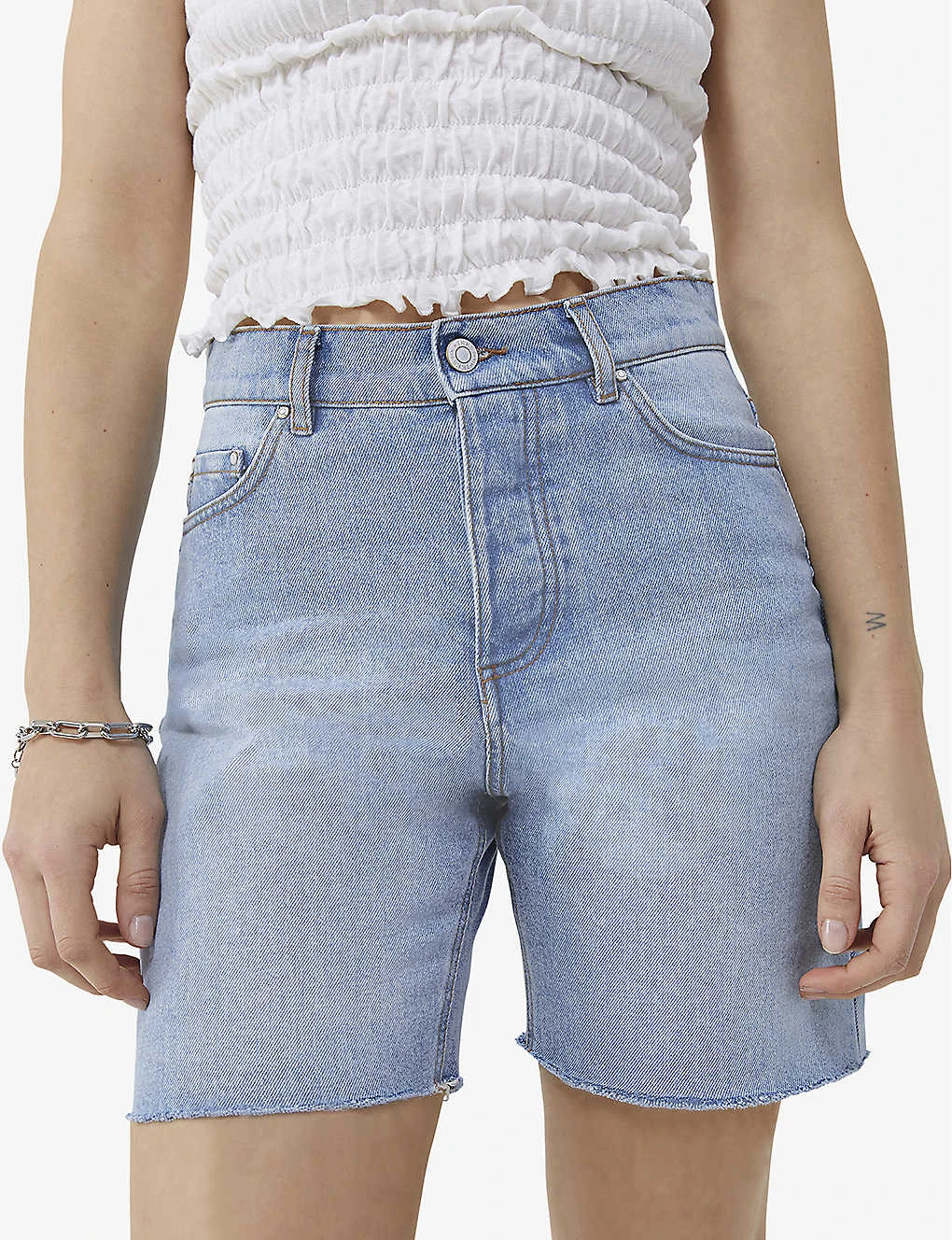 - High rise, belt loops, five pockets, raw hem finish, branded silver-tone hardware