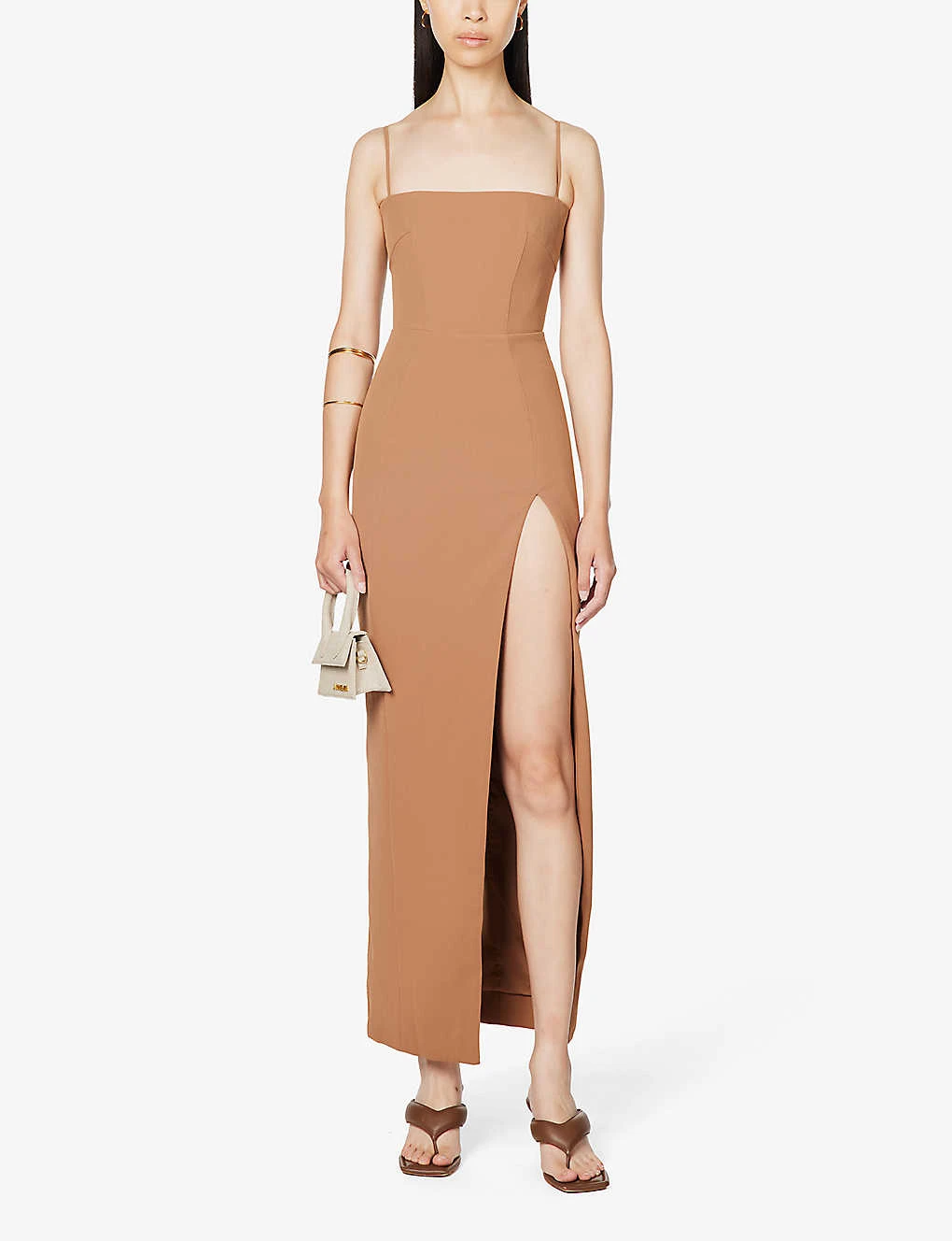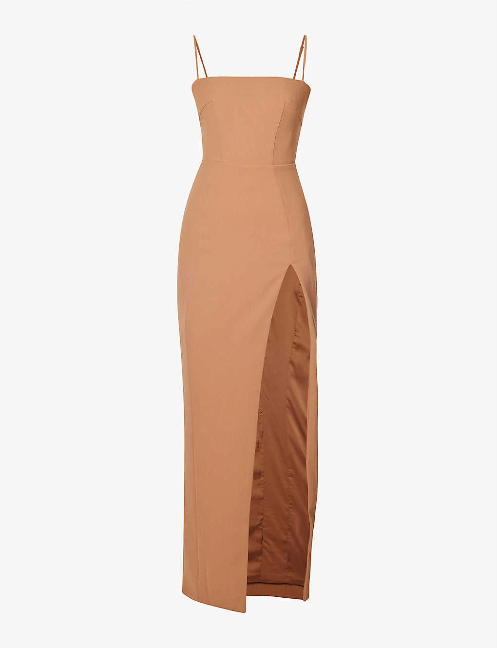 - Slim fit, square neckline, sleeveless, adjustable straps, darts at chest, corset bodice, split at front, panelled pattern, all-over crepe texture