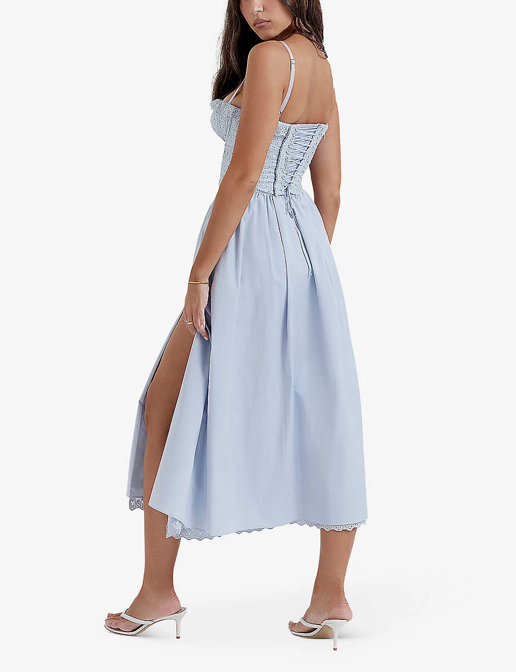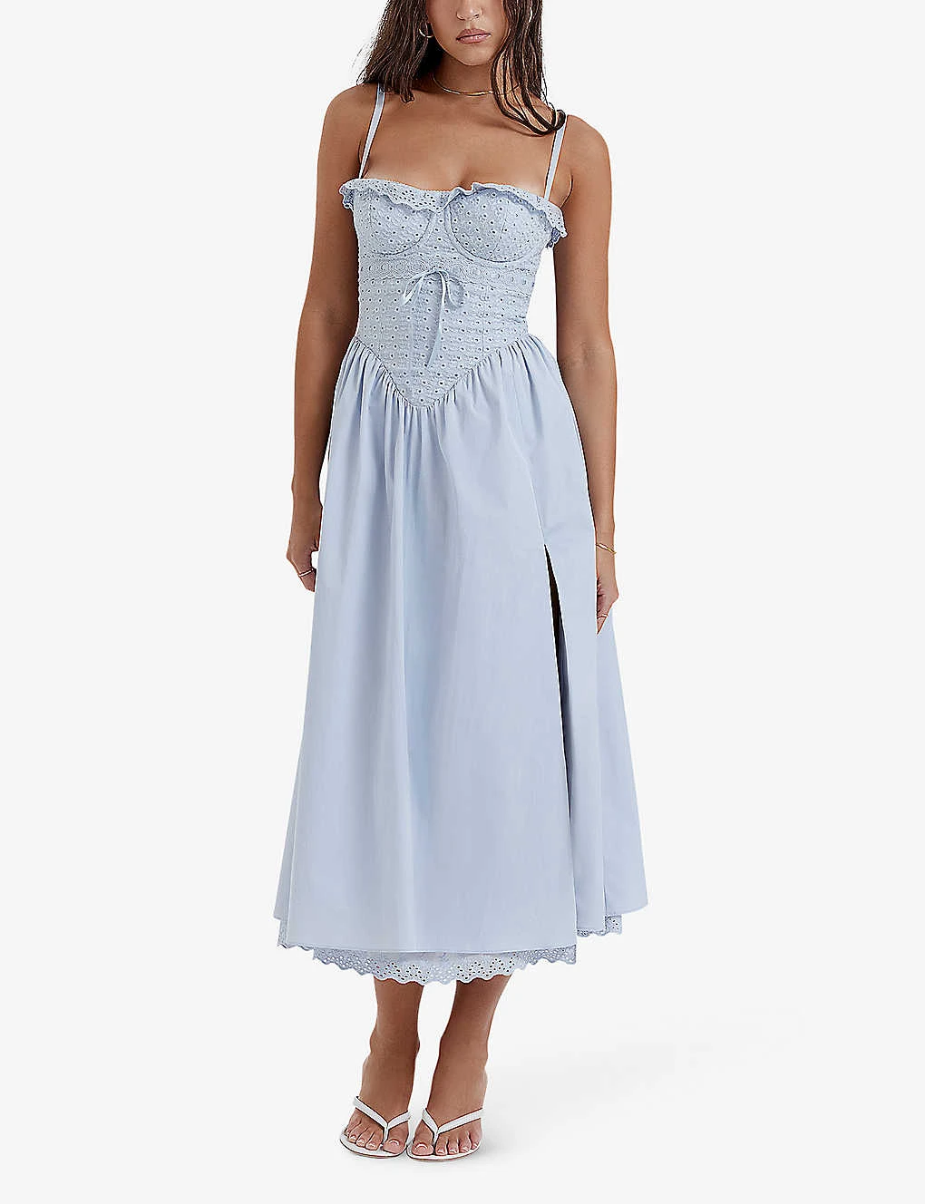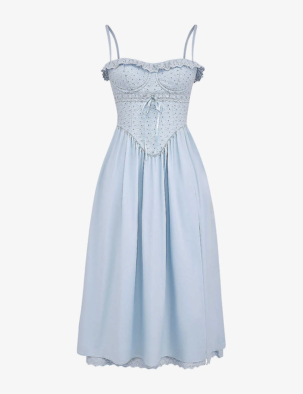 - Spaghetti straps, sleeveless, sweetheart neckline, bodice top, broderie anglaise, full skirt, tie-detail at the front and back, midi length