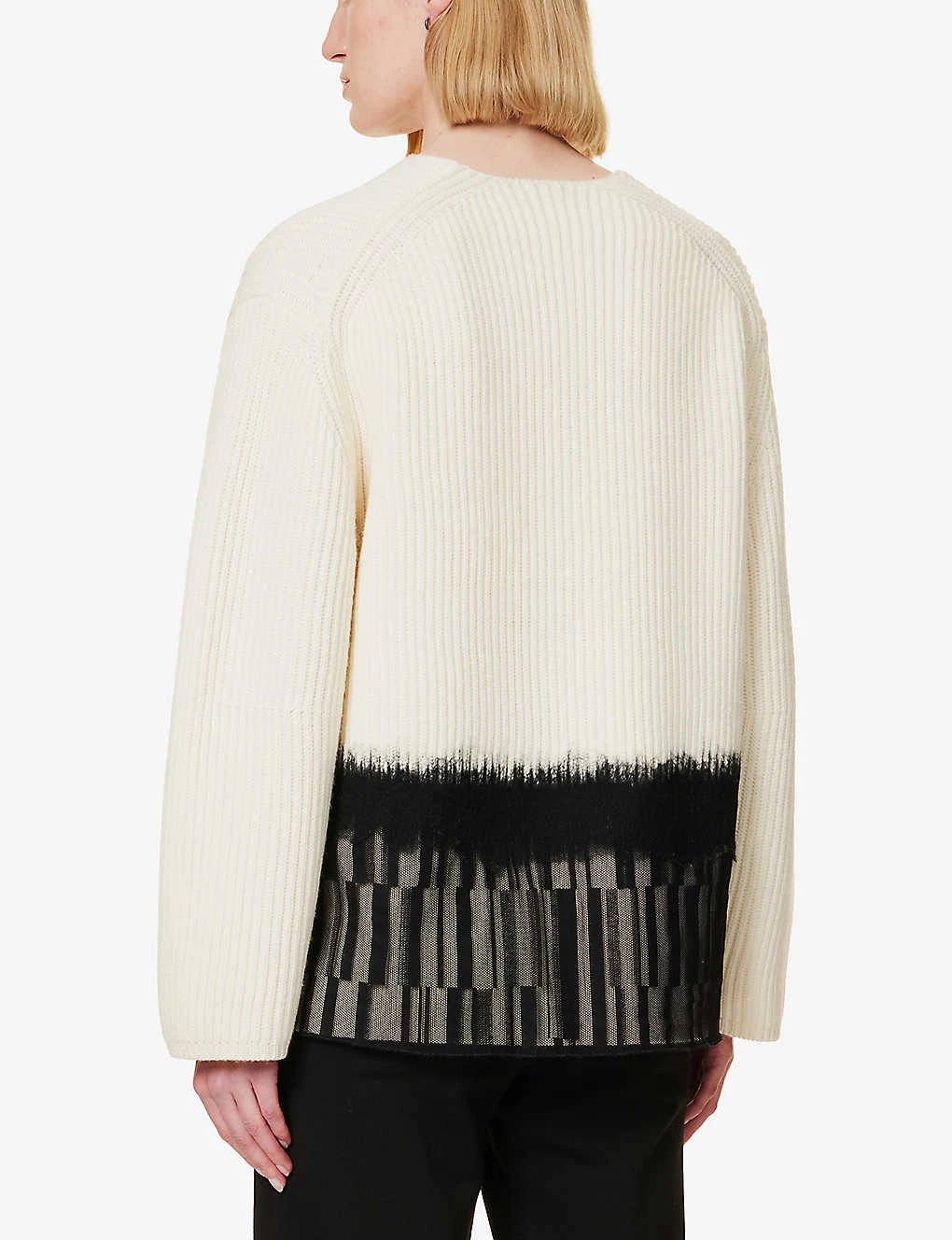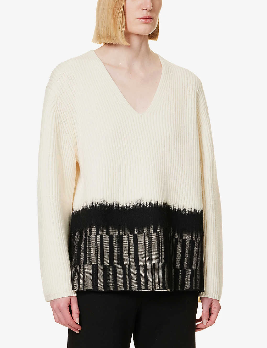 - Relaxed fit, V-neckline, long sleeves, ribbed medium knit texture, contrast panel at hem