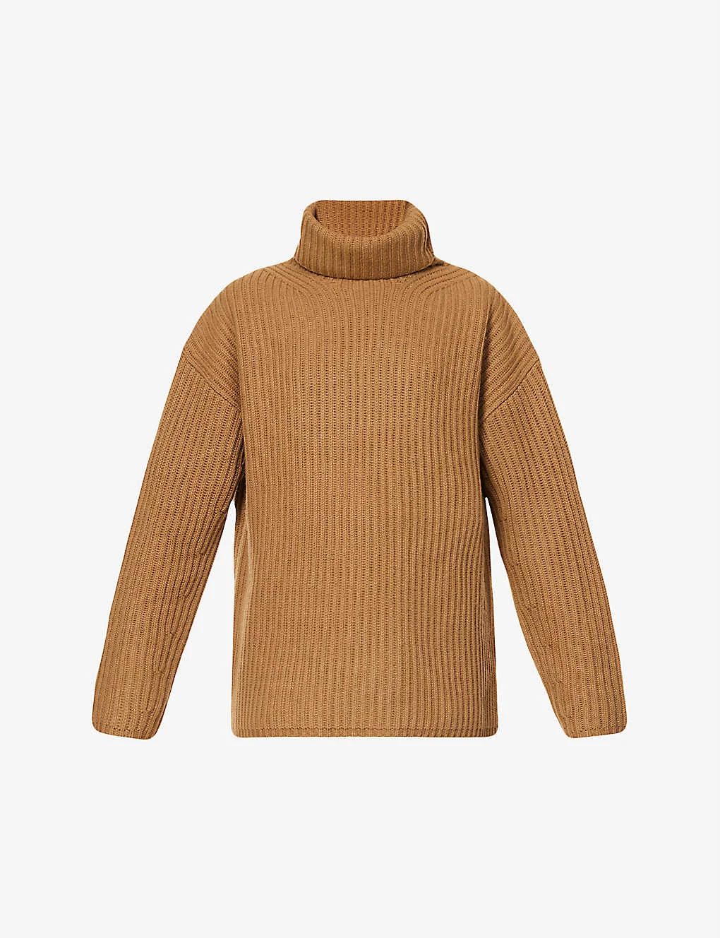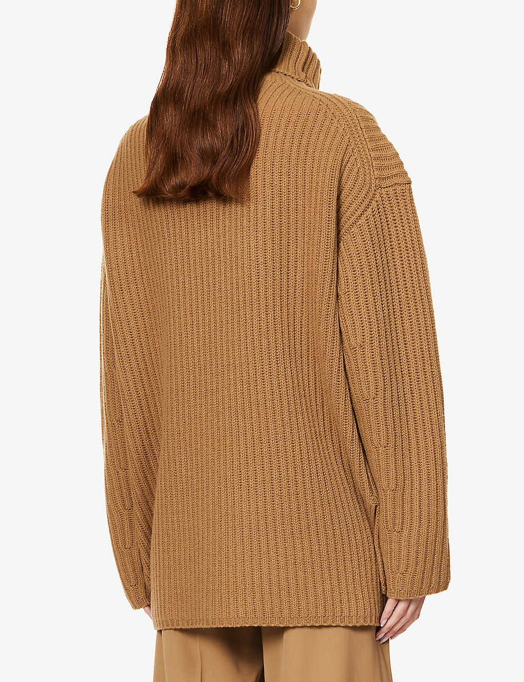 - Relaxed-fit, roll neck, dropped shoulders, long sleeves, dipped at back, split sides, all-over chunky purl knit, ribbed trims