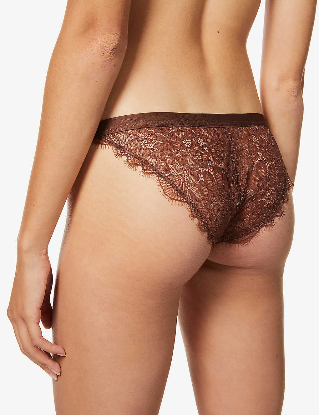 - Mid rise, elasticated waistband, lace panel at back, scalloped trims