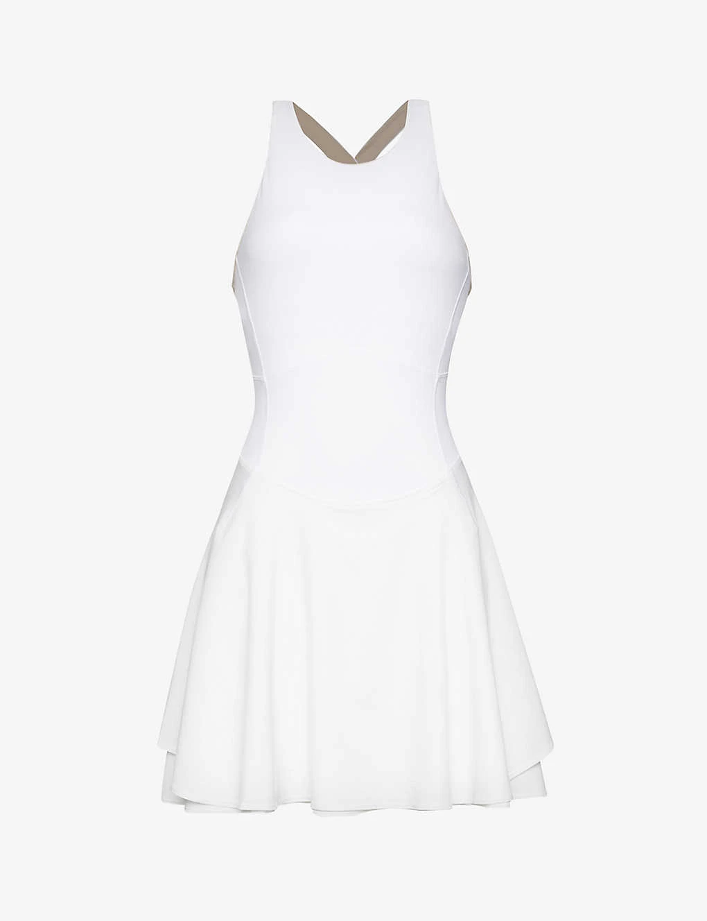 - Regular-fit, scoop neck, sleeveless, shoulder straps, exposed seams, flared skirt, short underlay, contrasting interior, cross-over straps at back, fully lined