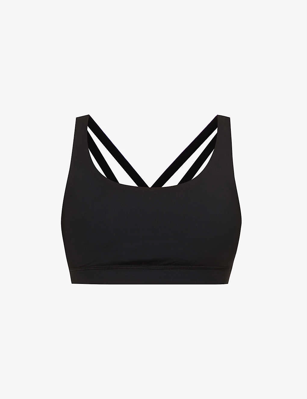 - Fitted, scoop neck, shoulder straps, removable padding at cups, medium support, moisture wicking, brand print at back, cross-over straps at back