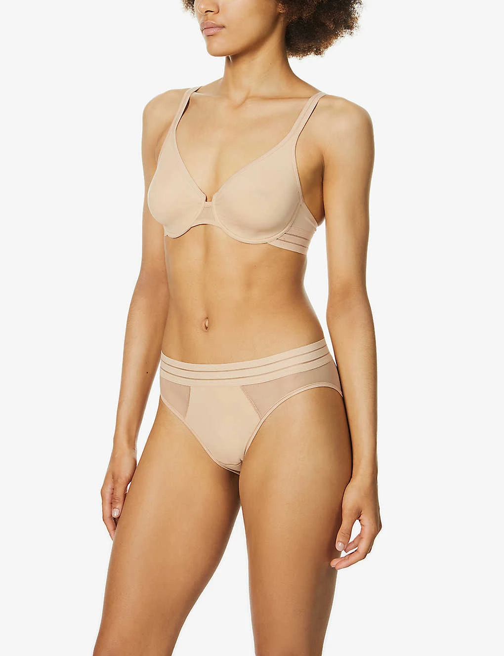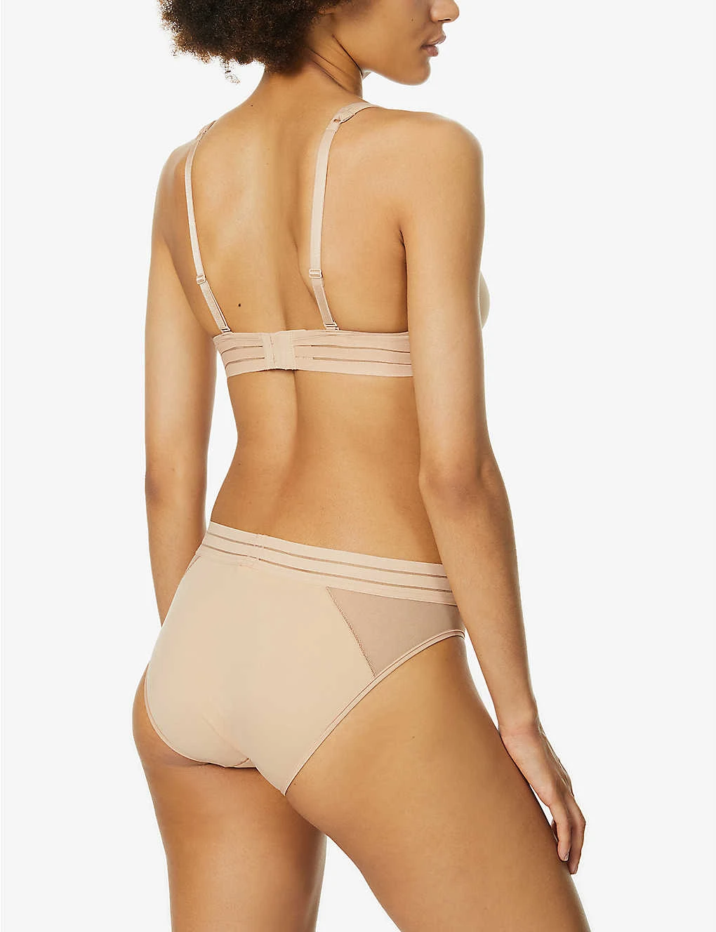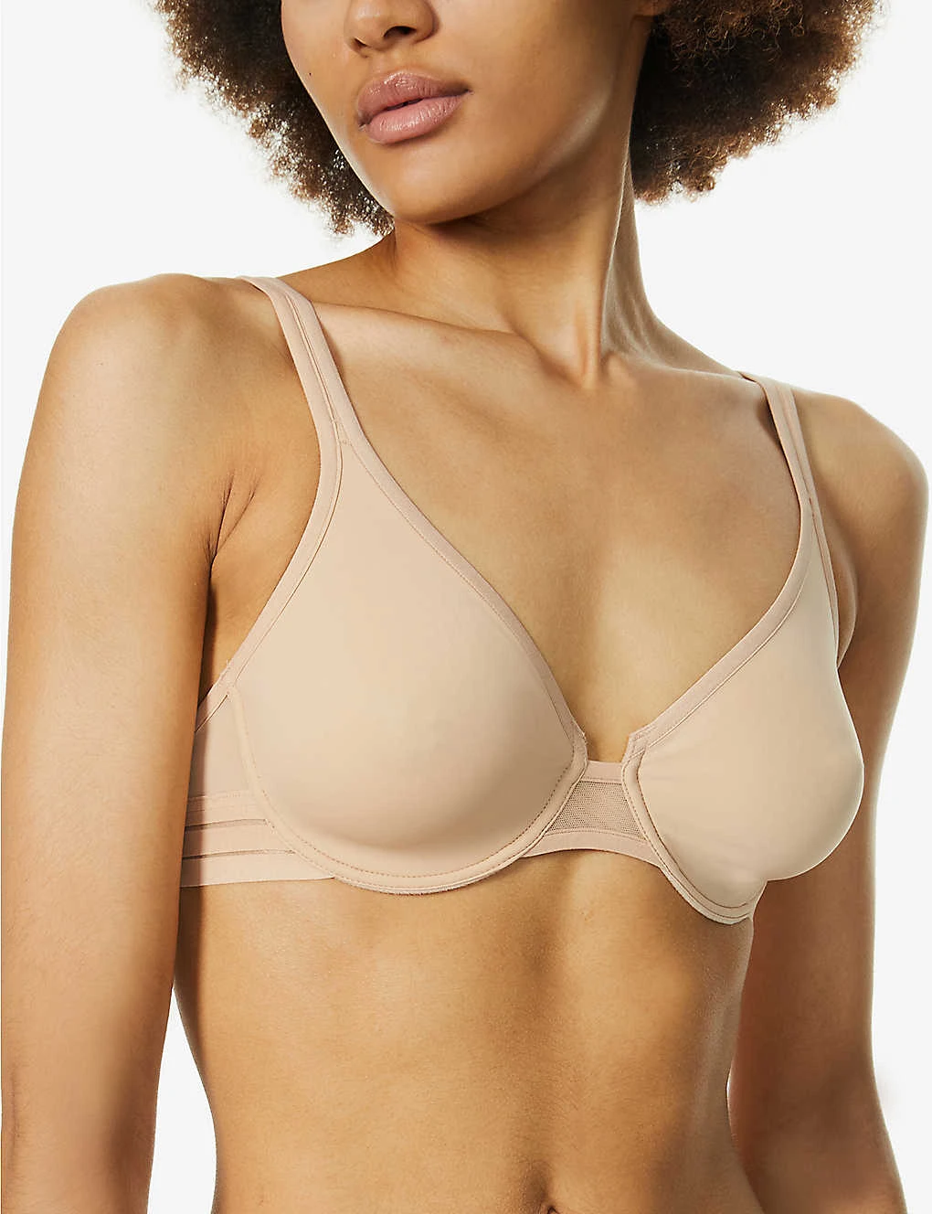 - V-neck, adjustable shoulder straps, soft moulded cups, underwiring at cups, mesh insert at bridge, elasticated striped panels at wings, semi-sheer mesh wings, tonal stitching