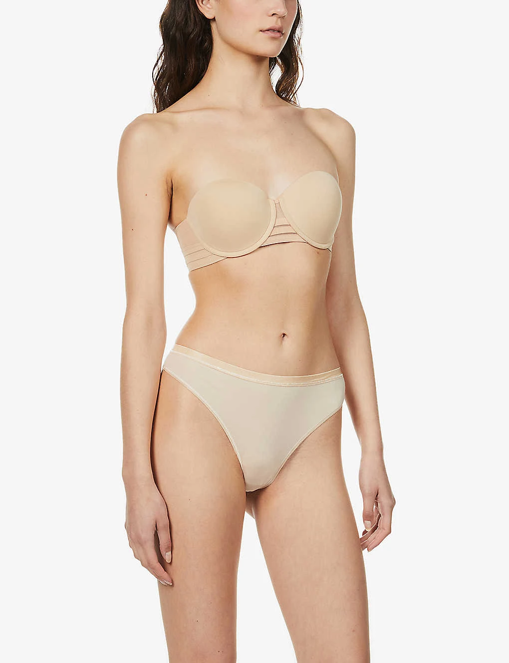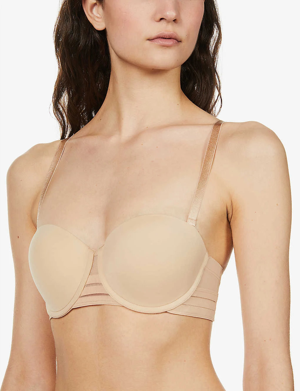 - V-neck, adjustable satin shoulder straps, soft moulded cups with underwiring, striped panels at under band, elasticated under band, tonal stitching