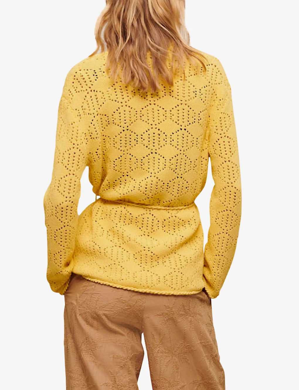 - Relaxed fit, V-neck, long sleeves, four patch pockets at front, all-over open stitch fabrication, gold-tone hardware, unlined