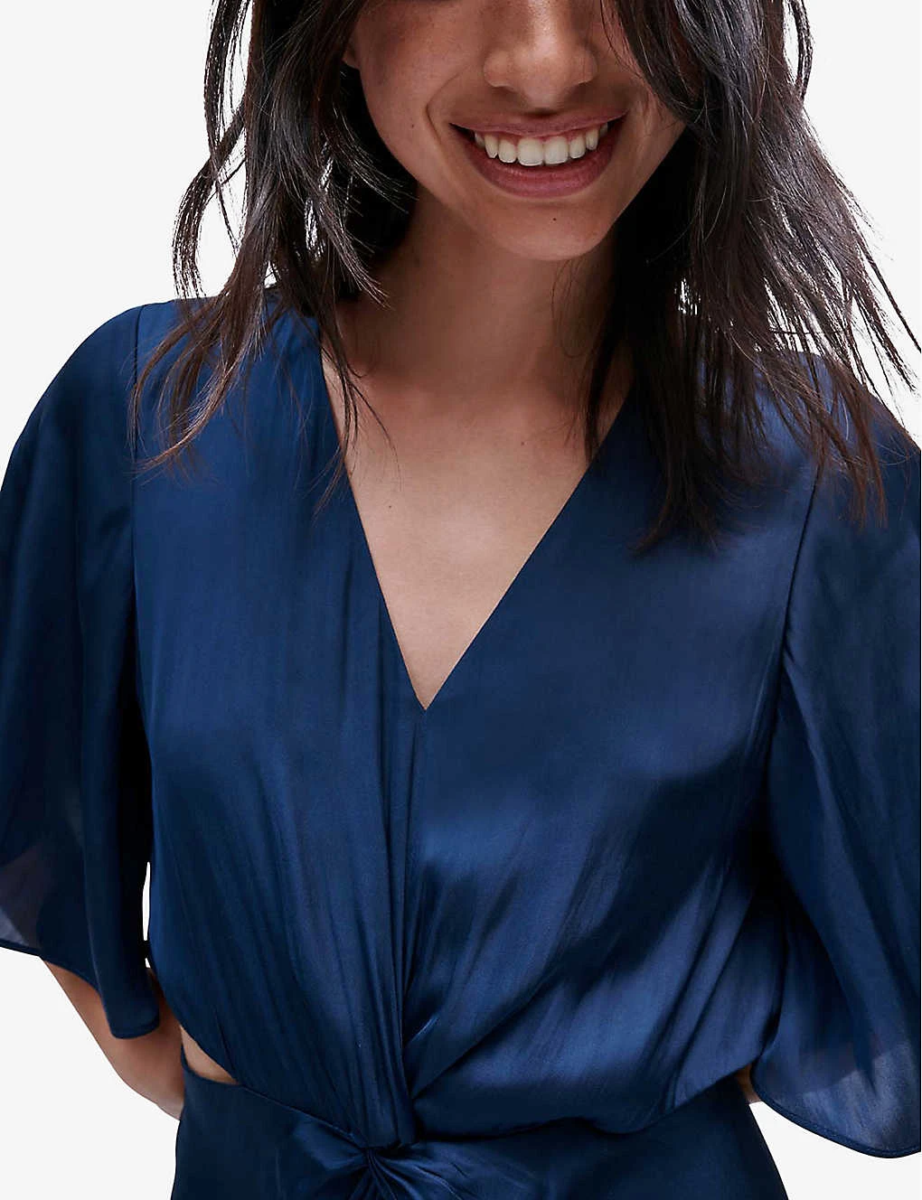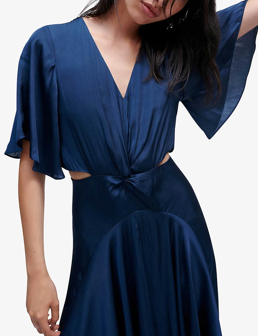 - Maxi length, V neck, short flowy sleeves, cut-out to the sides and back, twist at the front, draped skirt, asymmetric hem, concealed back zip fastening