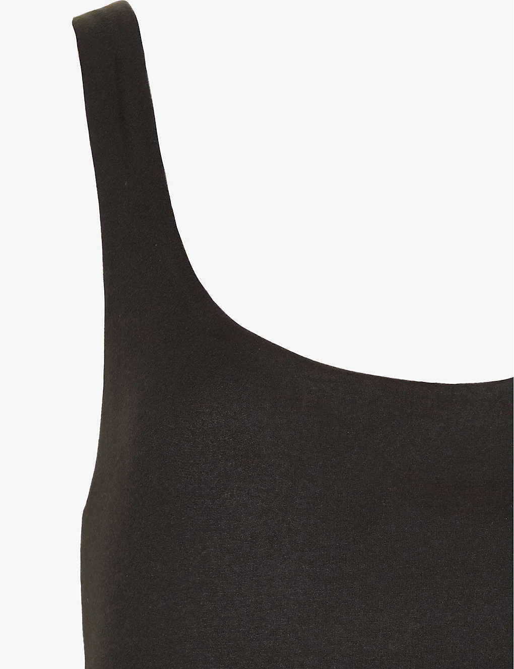 - Fitted, scoop neck, shoulder straps, exposed centre seam at back, fully lined