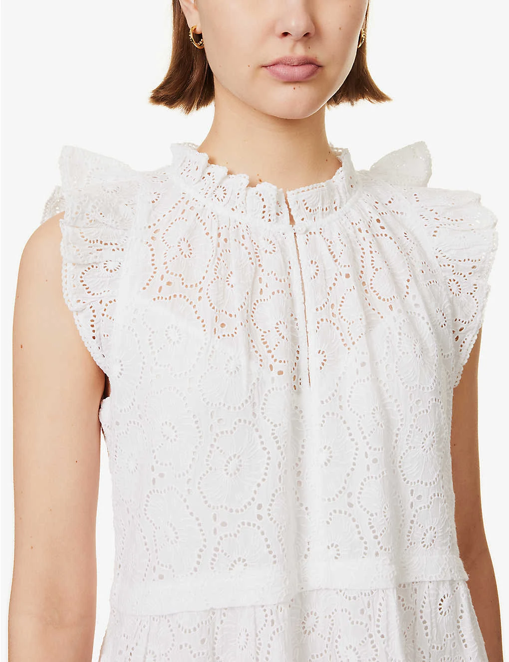 - Regular-fit, round neck, frilled trim at neck, capped sleeves, keyhole at front, all-over broderie panels, flared skirt, fully lined