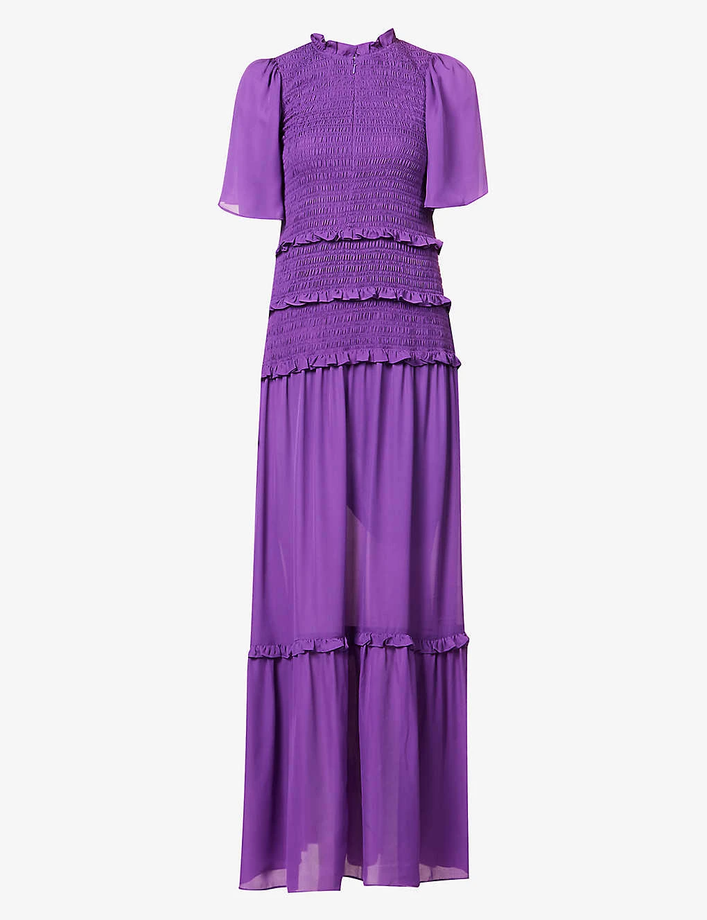 - Regular fit, round neckline, short flutter sleeves, shirred bodice, tiered flared hem, ruffle trims