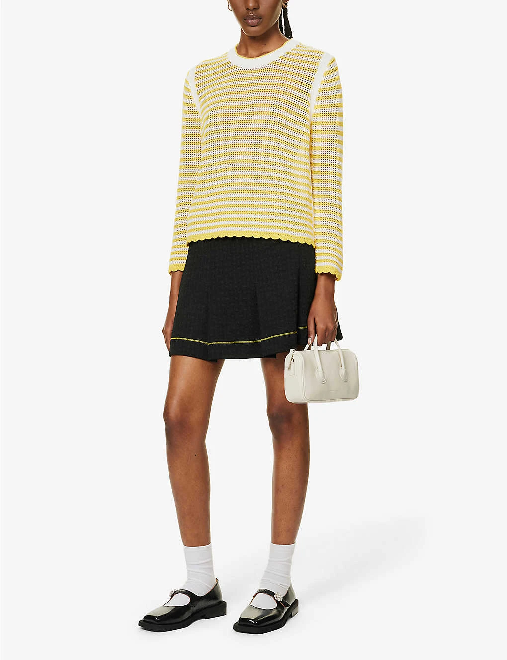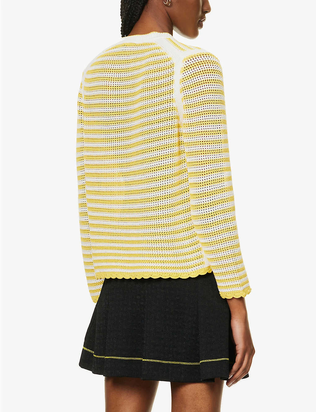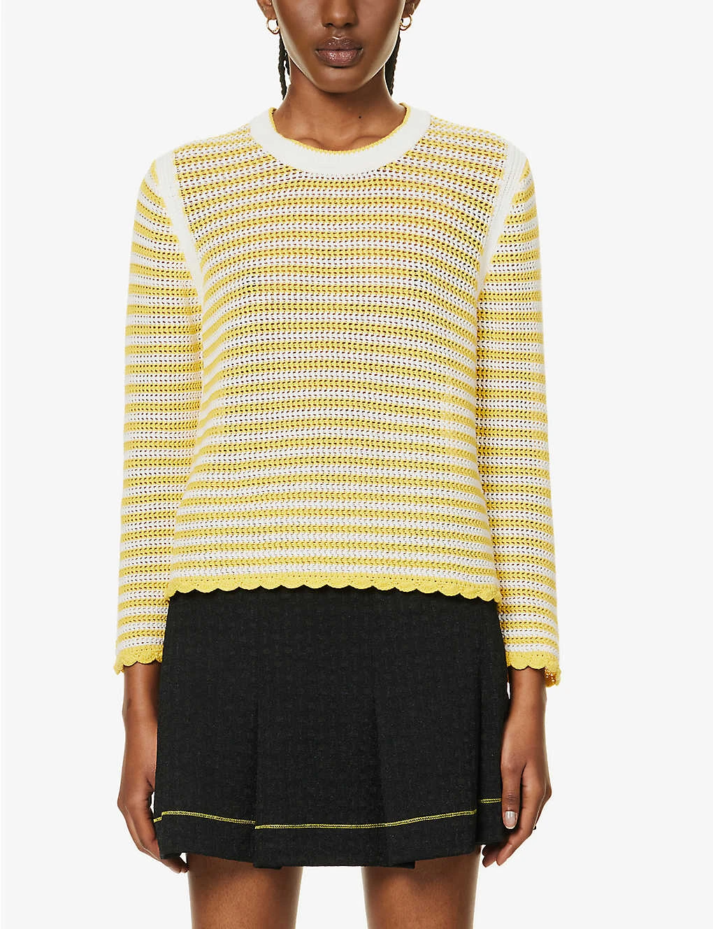 - Regular fit, round neck, long sleeves, all-over stripe pattern, crochet knit fine texture, scallop trims