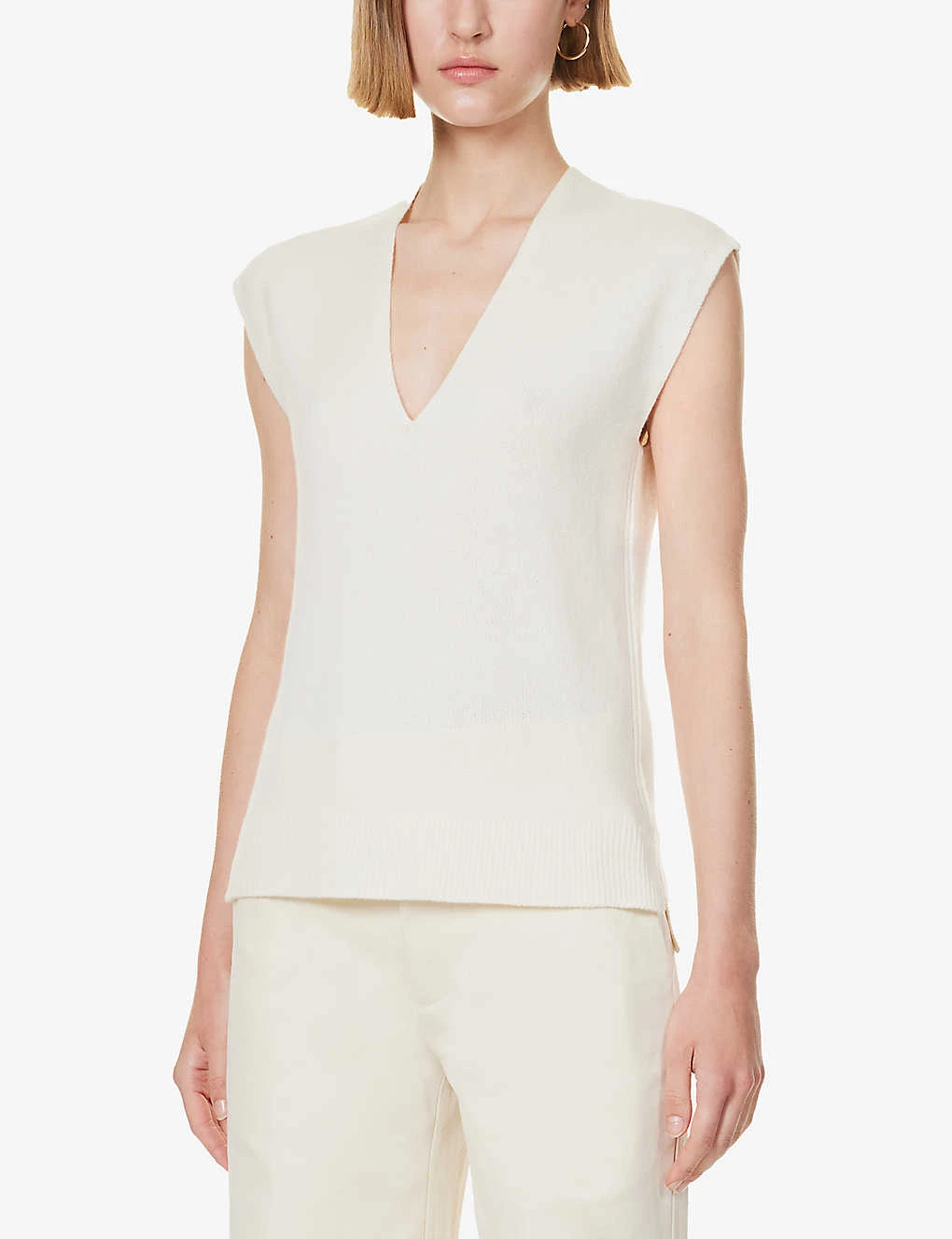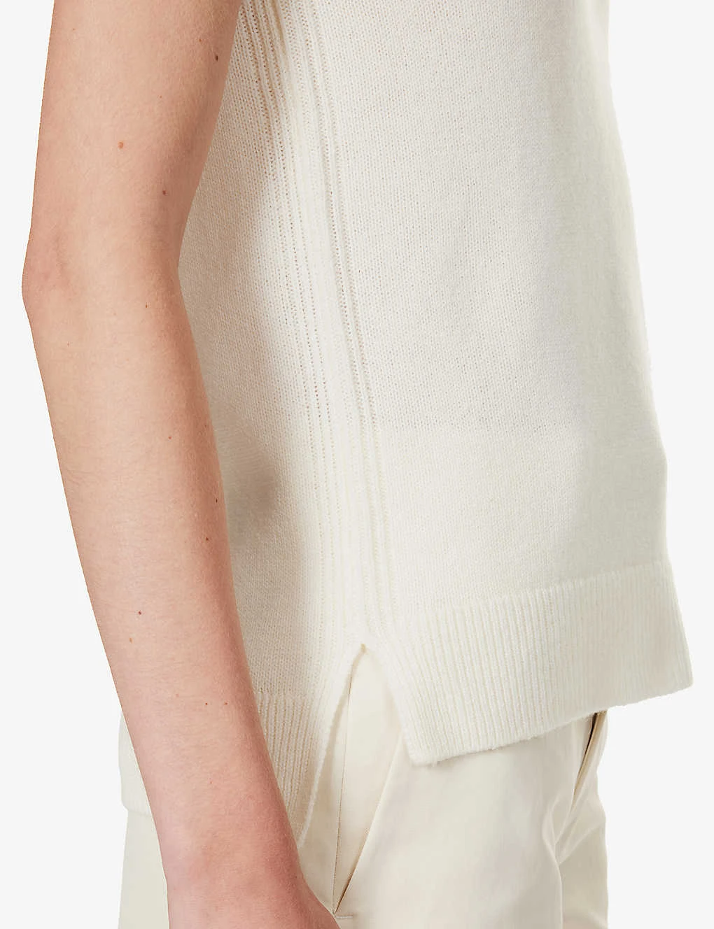 - Relaxed fit, V neck, sleeveless, all over knitted, split at sides, ribbed straight hem