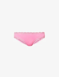 - Mid-rise, elasticated waistband, lace trims, mid-coverage at back